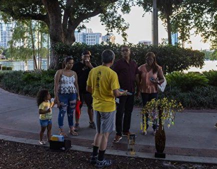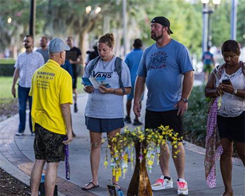 在奥兰多市中心的伊奥拉湖公园(Lake Eola Park),法轮功学员们向世人讲述中共于1999年7月20日发起的、至今仍在持续的残酷迫害。
