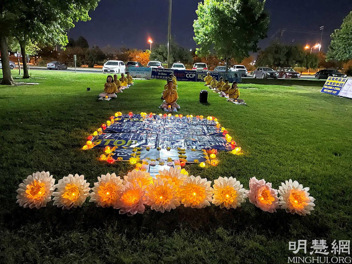 法轮功学员们搭起呼吁“解体中共”、“制止中共活摘器官”等标语的展板,在学员队列的正前方摆放上被迫害致死的学员遗像和三幅写有“呼吁停止迫害法轮功”、“中共活摘器官天理难容”和“法轮功反迫害22周年”的横幅,开始了集体炼功、诗朗诵、学员代表发言和烛光悼念的活动。来往的路人被祥和的炼功场面所吸引,在听明白了法轮功被迫害的真相后,纷纷签名支持反迫害。