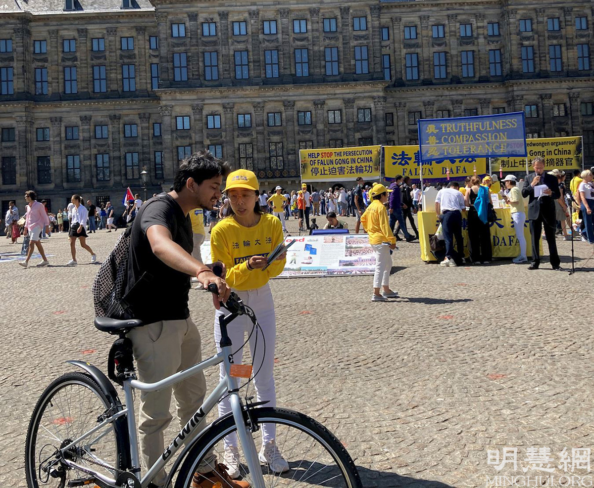 一位华人林先生告诉法轮功学员,他在荷兰已经生活两年多了。他说:“因为我不喜欢中国才来到这里。我在国内上大学的时候就天天通过动态网翻墙,了解了很多真相。我还通过动态网早早做了三:退.。我从高中的时候就不唱国歌了,知道那都是假的。我还知道天安门自焚也是假的,中共经常撒谎造假。他们能做出活摘器官这种事,说明中共很残忍。