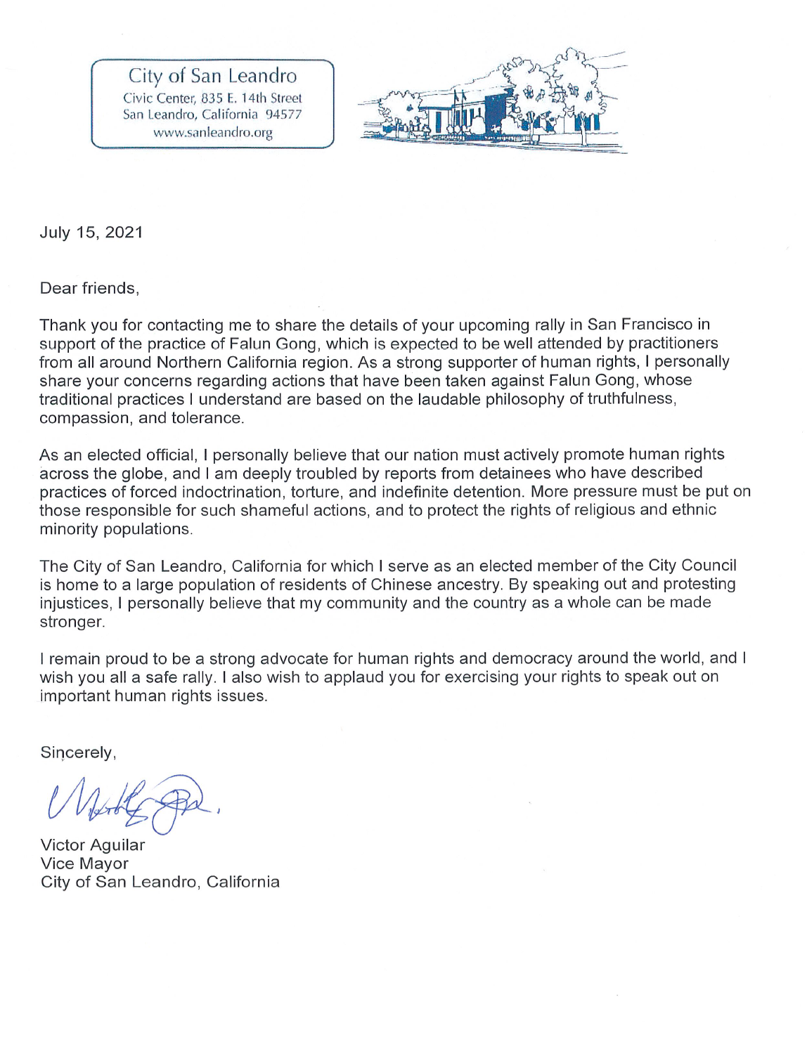 北加州旧金山湾区东湾圣利安珠市(San Leandro)副市长维克多·阿吉拉尔(Victor Aguilar)特地为旧金山的“反迫害二十二周年集会游行”致支持信,支持法轮功反迫害,并呼吁解体中共,结束迫害。
