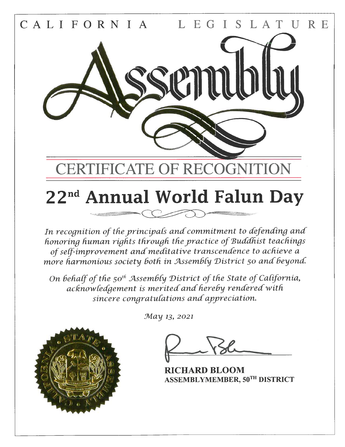 加州州议会第五十选区议员理查德·布鲁姆(Richard Bloom)在嘉奖状中表彰法轮大法的原则,称赞法轮功学员捍卫人权的承诺与实践,赞扬法轮功学员通过修炼方法自我提升,促进社会的和谐。