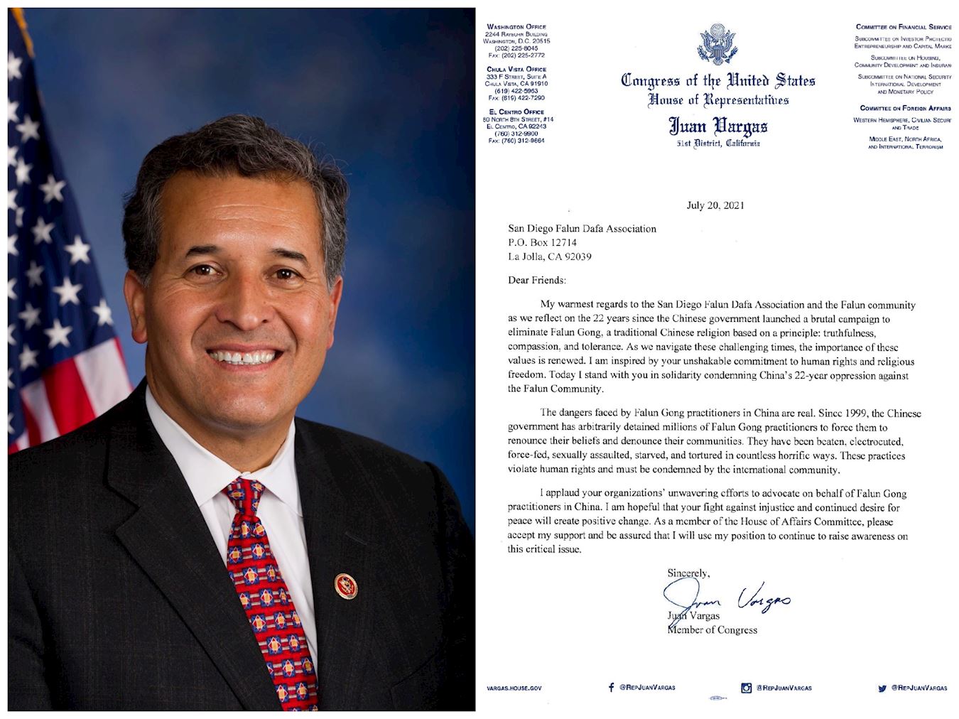 加州联邦众议员胡安·巴尔加斯(Juan Vargas)在声援信中说:“我们正在反思中国(中共)政府发起的企图消灭法轮功的残暴运动,这场迫害持续了二十二年。法轮功是基于‘真、善、忍’原则的传统的中国信仰,当我们在这个充满挑战的时代前行时,这种原则的重要性再次被认识。”