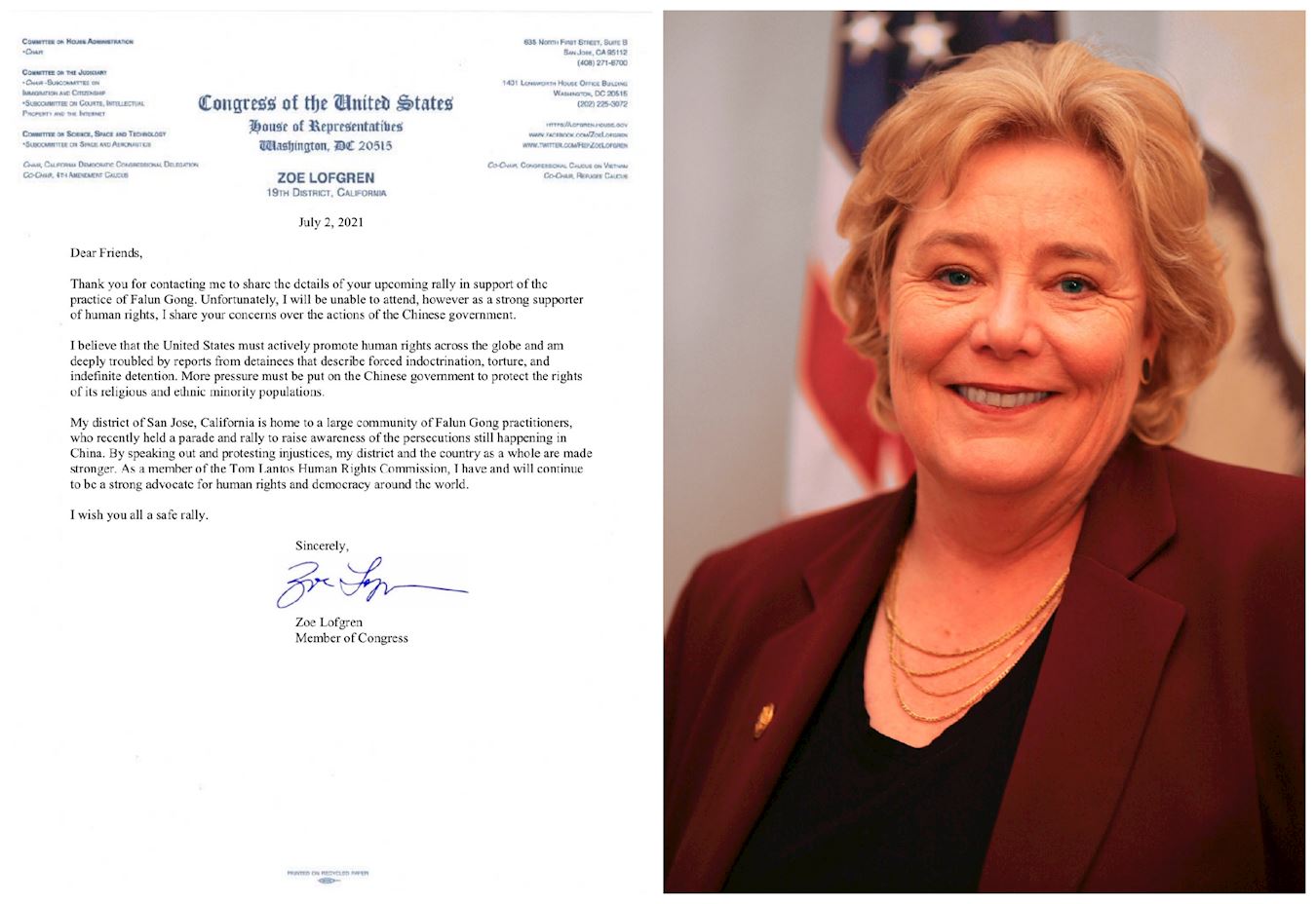 加州第五十一选区联邦众议员佐伊·洛夫格伦(Zoe Lofgren)在声援信中说:“我所在的加利福尼亚州圣荷西地区拥有一个庞大的法轮功学员社团。他们最近举行了一次游行集会,以唤起人们对仍在中国发生的迫害的关注。通过大声疾呼、抗议不公正的行为,我所在地区和整个美国都变得更加强大。”
