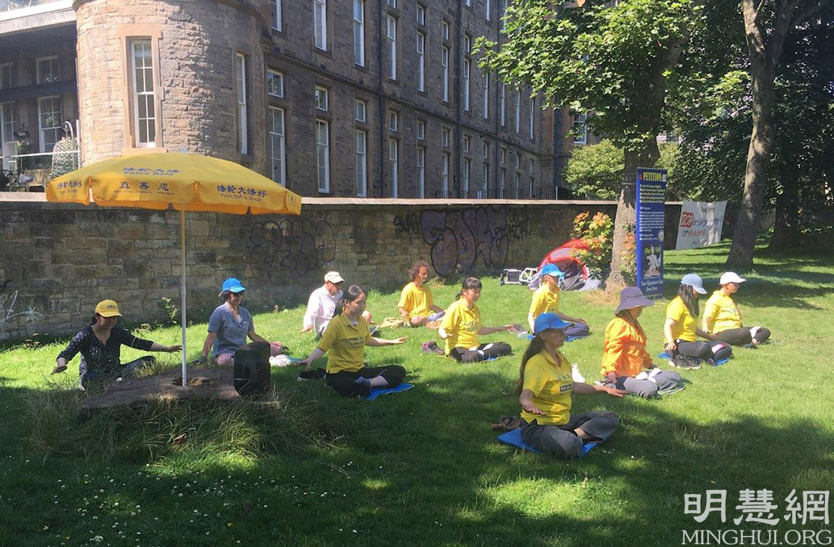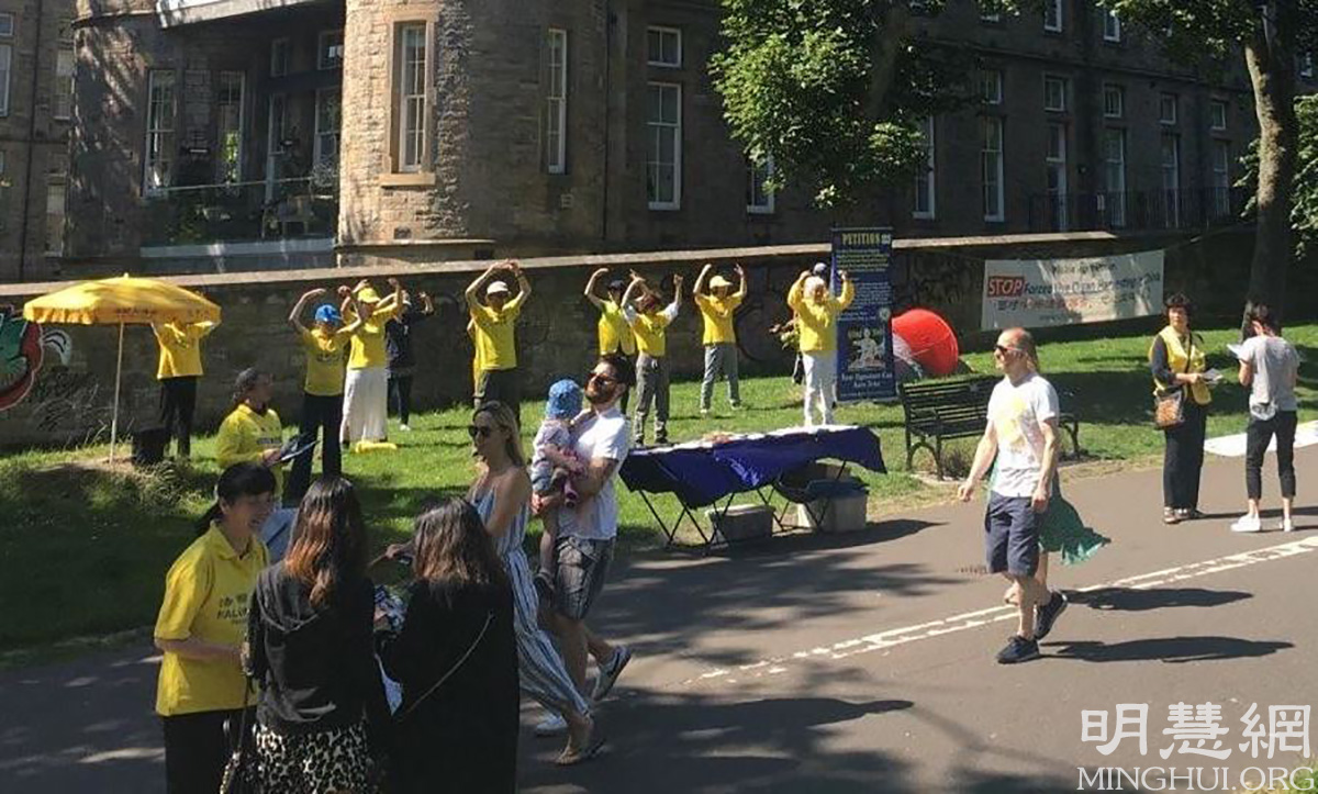 当天,爱丁堡风和日丽,大型公共公园麦道斯(The Meadows)迎来许多外出享受好天气的人。在那里,学员们竖起介绍法轮功的展板,向民众展示动作优美的五套功法;他们也拉起制止活摘器官的醒目横幅,呼吁大家连署签名,以制止这场残酷的迫害。