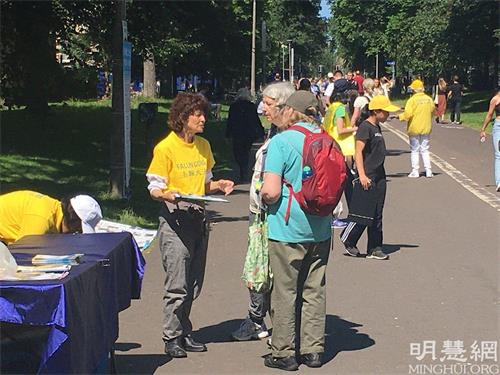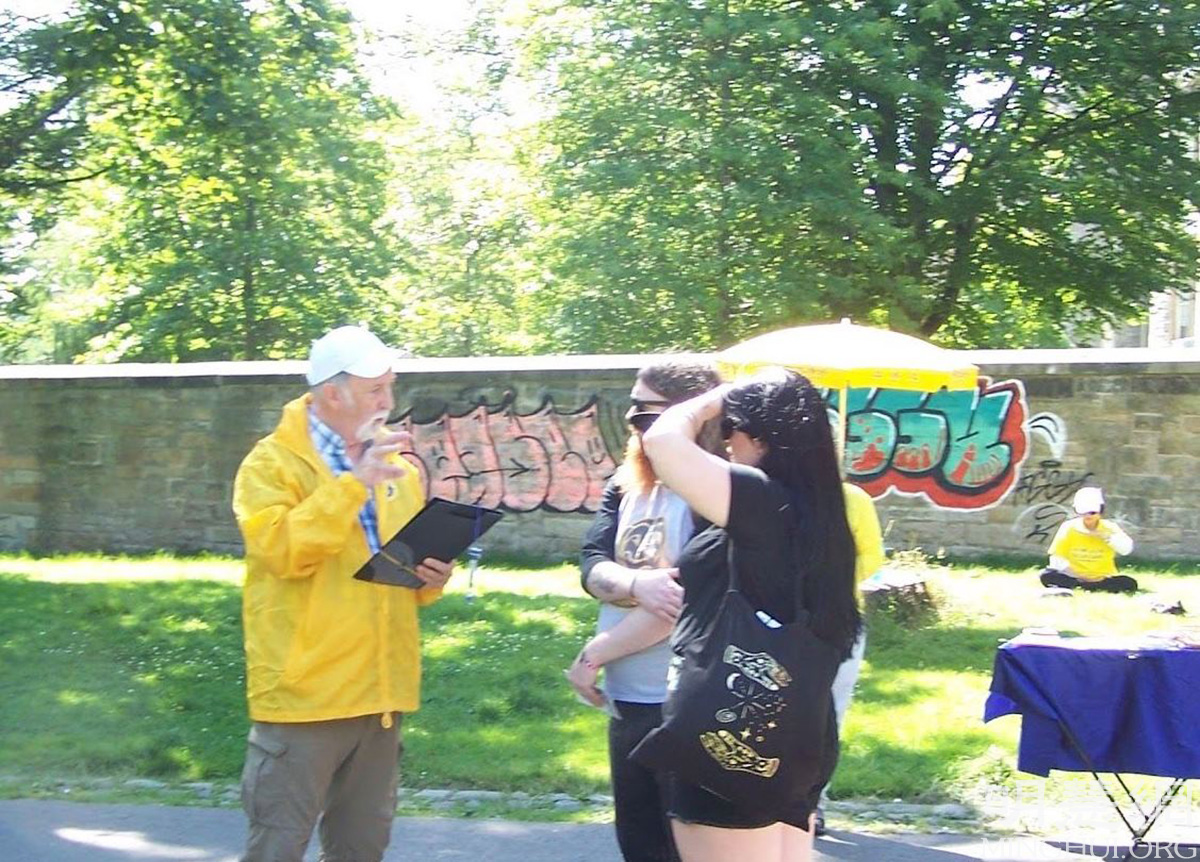 一对中年夫妇在路过时,毫不犹豫地签下他们的名字。学员问他们是否了解法轮功被迫害的情况,妻子回答说,他们都是做人权工作的,但对细节还不是很清楚。