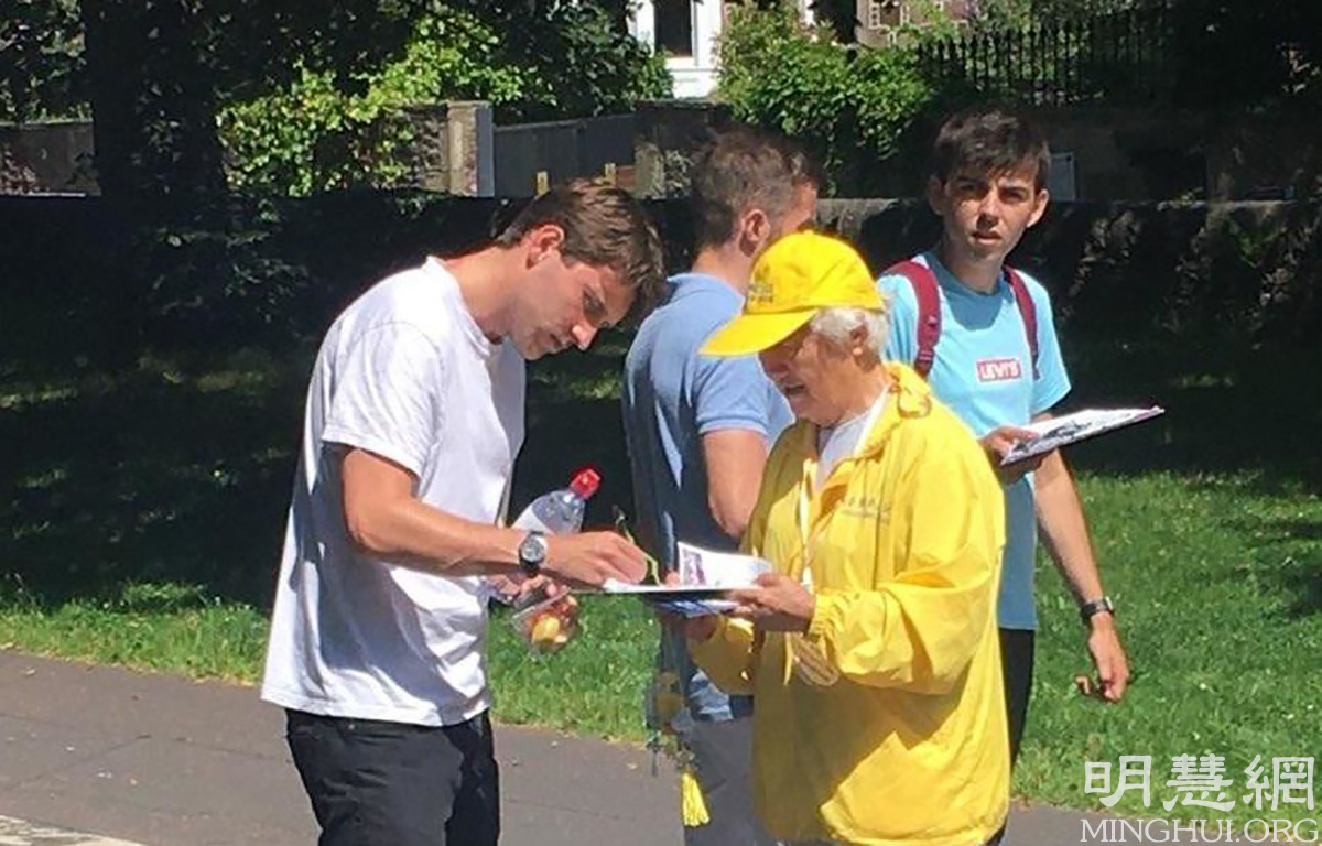 一位四十岁左右的苏格兰男子也签名支持反迫害。他说,自己在香港有朋友,知道那里被剥夺民主自由的情况,所以不喜欢中共。他询问了当地法轮功免费教功班的信息,还说如果以后还有类似的街头活动,他也想要参加,帮忙让更多人知道中共恶行。