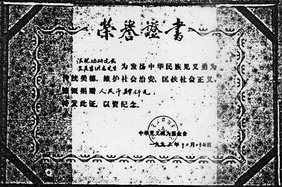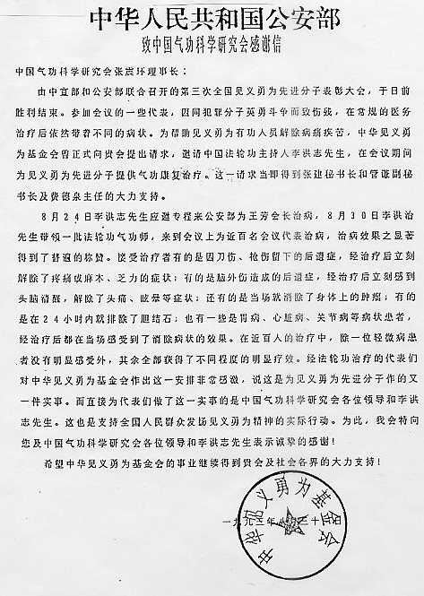 -1993年8月31日,中国公安部所属中华见义勇为基金会致信中国气功科学研究会,感谢李洪志先生为全国第三届见义勇为先进分子表彰大会代表免费提供康复治疗。