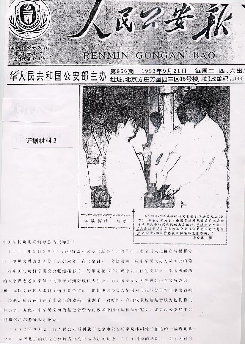 -1993年9月21号,公安部主办的《人民公安报》刊登文章《法轮功为见义勇为先进份子提供康复治疗》,称公安部见义勇为先进分子“经调治后普遍收到了非常好的效果”。同年12月27号,公安部所属的“中华见义勇为基金会”向李先生颁发荣誉证书。