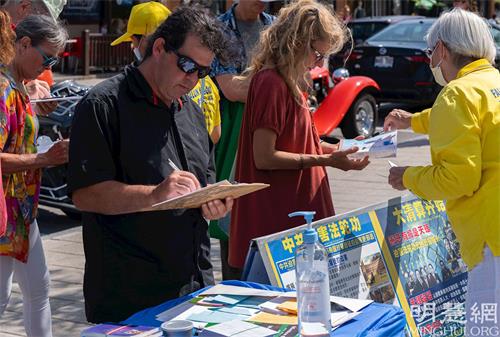 当天的活动地点在镇中心的教堂广场上,高坡上醒目的横幅——“法轮大法好”、“停止迫害法轮功”、“停止活摘法轮功学员器官”,天国乐团的乐声,以及优缓的功法,吸引了一拨又一拨的民众来到人行道上的征签台,向法轮功学员了解情况。得知活摘器官的罪行后,很多民众表示震惊和痛心,纷纷在反迫害的征签信上签名。还有不少民众表示要学炼法轮大法。