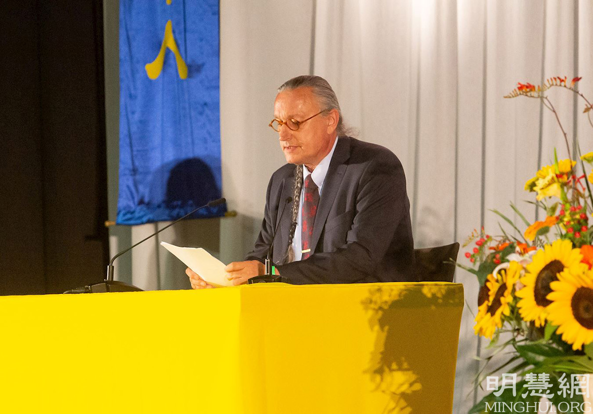 ![]() 图1:来自德国阿尔卑斯山区的法轮功学员沃尔纳(Wollner)在法会上发言。 |