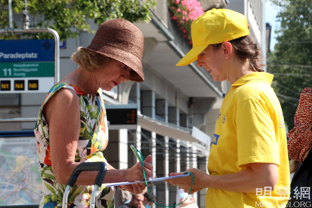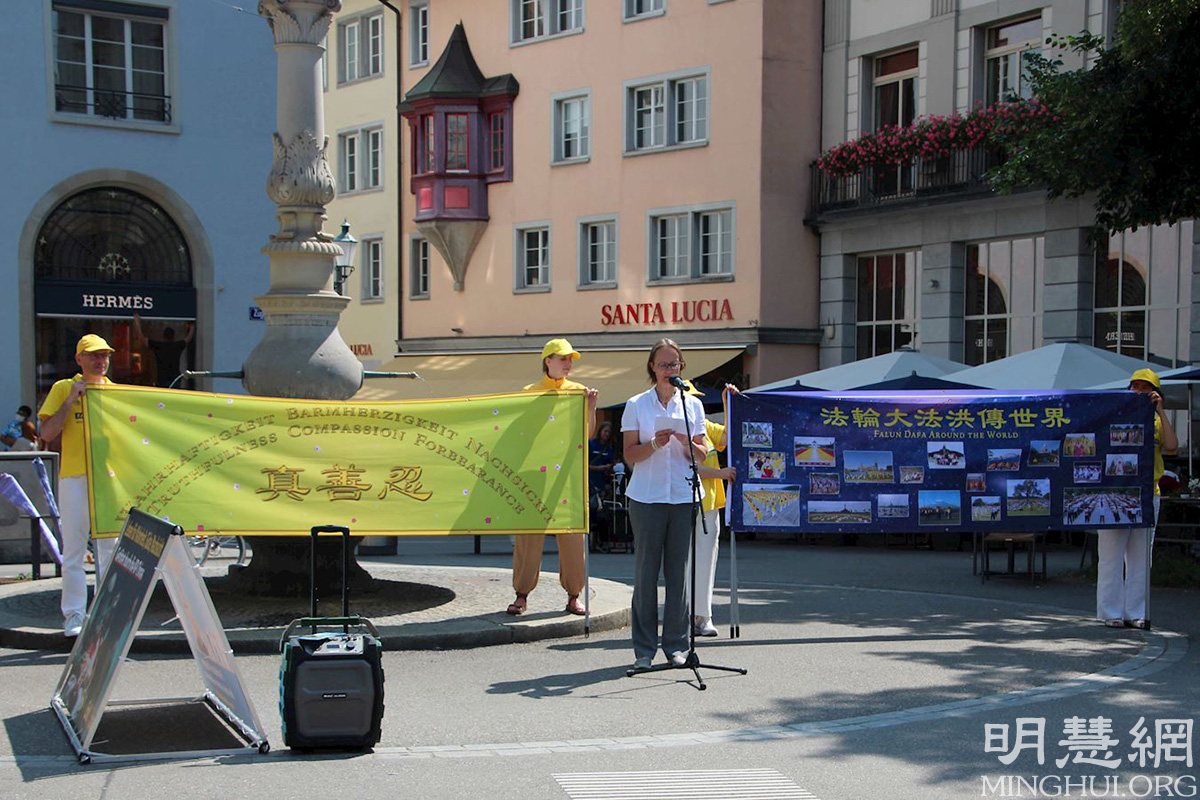 二零二一年七月二十三日,让法蒂玛提前下了电车的原因是,她看到法轮功学员在瑞士苏黎世市中心阅兵广场(Paradeplatz)举行的反迫害二十二年的活动。几位身着黄色服装的法轮功学员在闹市中静静地打坐;右边几位学员轮流演讲,介绍法轮大法的美好及揭露中共二十二年来对法轮功学员的迫害。