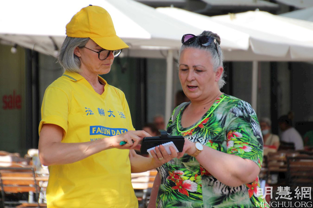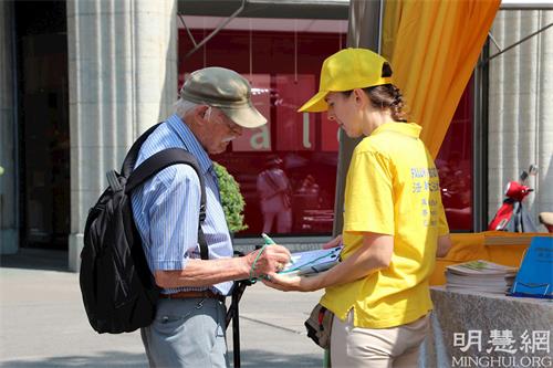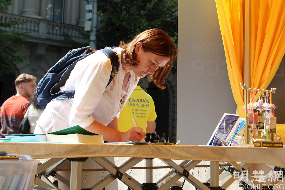 当天的活动也让学摄影的日本女士克里斯蒂娜(Cristina)驻足,她希望能通过签名帮助制止迫害。还有中国人主动找西方学员交谈,告诉她,他认为法轮功学员的活动很好。