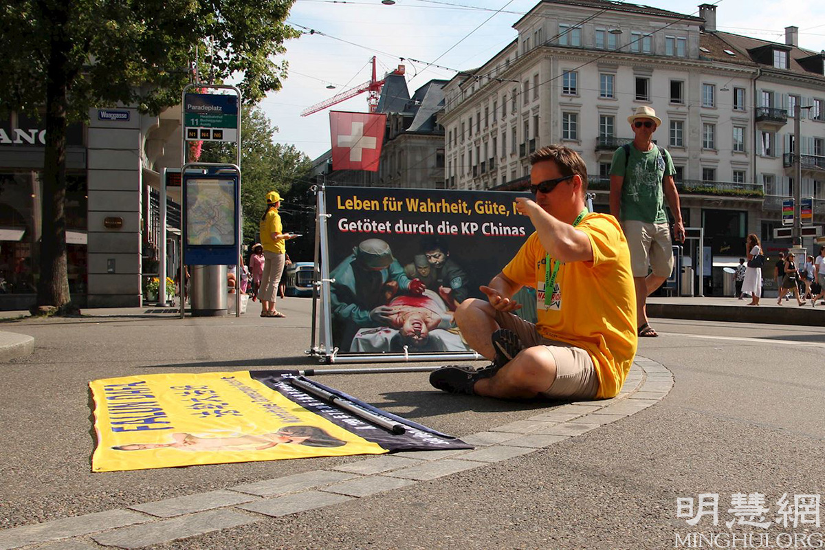 准新郎里科·福施(Rico Fausch)正在苏黎世和朋友一起欢度他的单身派对,看到法轮功学员打坐后,他觉得:“他们极为放松,舒展,完全回归自我。”福施先生也席地而坐,跟着学员学炼功法动作。