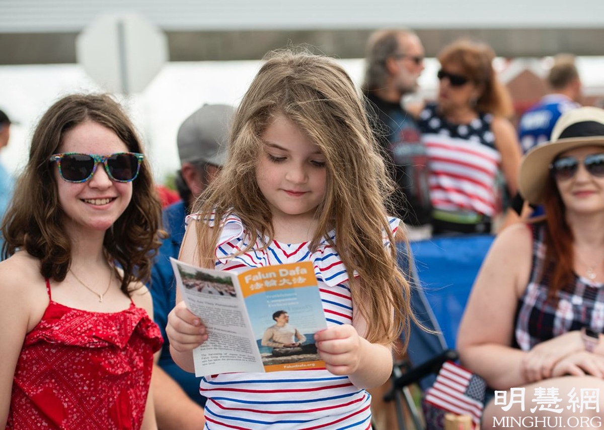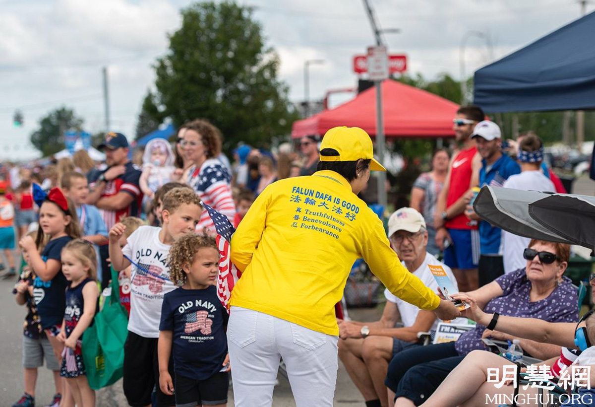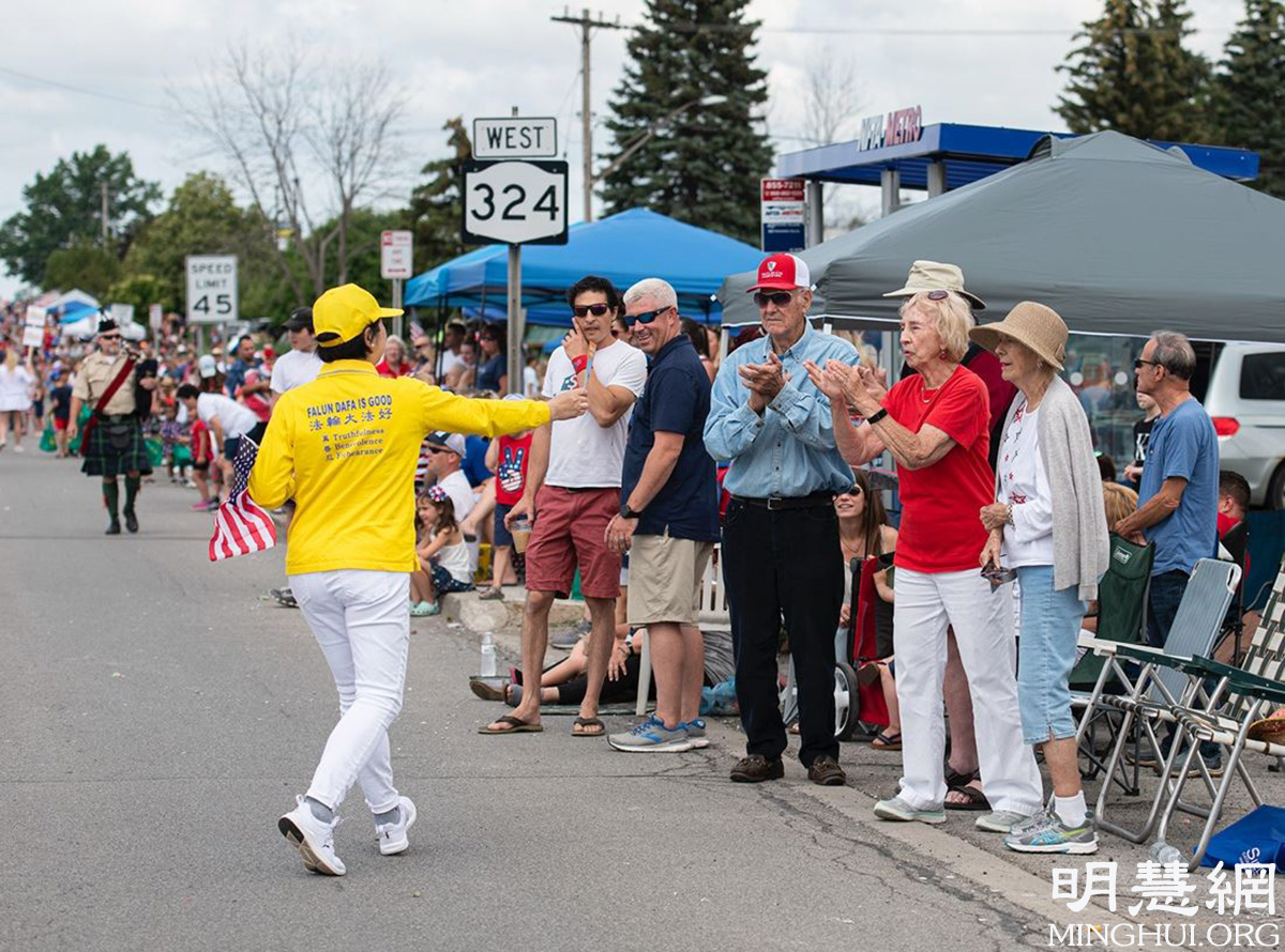 游行中,花车所到之处常常引来观众们的掌声。他们纷纷接过法轮功学员递上的介绍大法的小册子。当问及他们的感受时,有的观众说:“法轮功学员看上去很美,很平和。我回去后要仔细阅读你们的资料。”