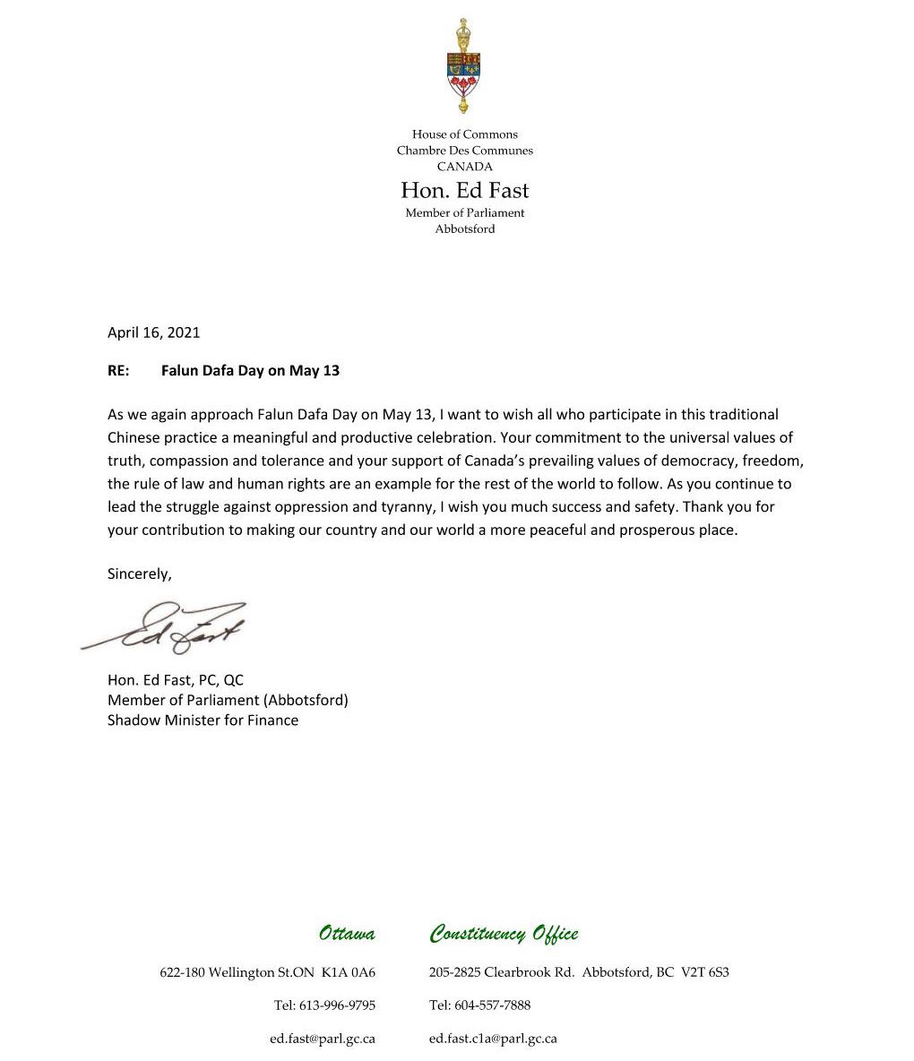 联邦保守党影子内阁财政部长、阿博茨福德选区(Abbotsford)国会议员法斯特(Ed Fast)在贺信中写道:“在你们继续引领反迫害和对抗暴政之时,我祝你们成功和安全。感谢你们为我们的国家和世界更加和平、繁荣所做的贡献。”