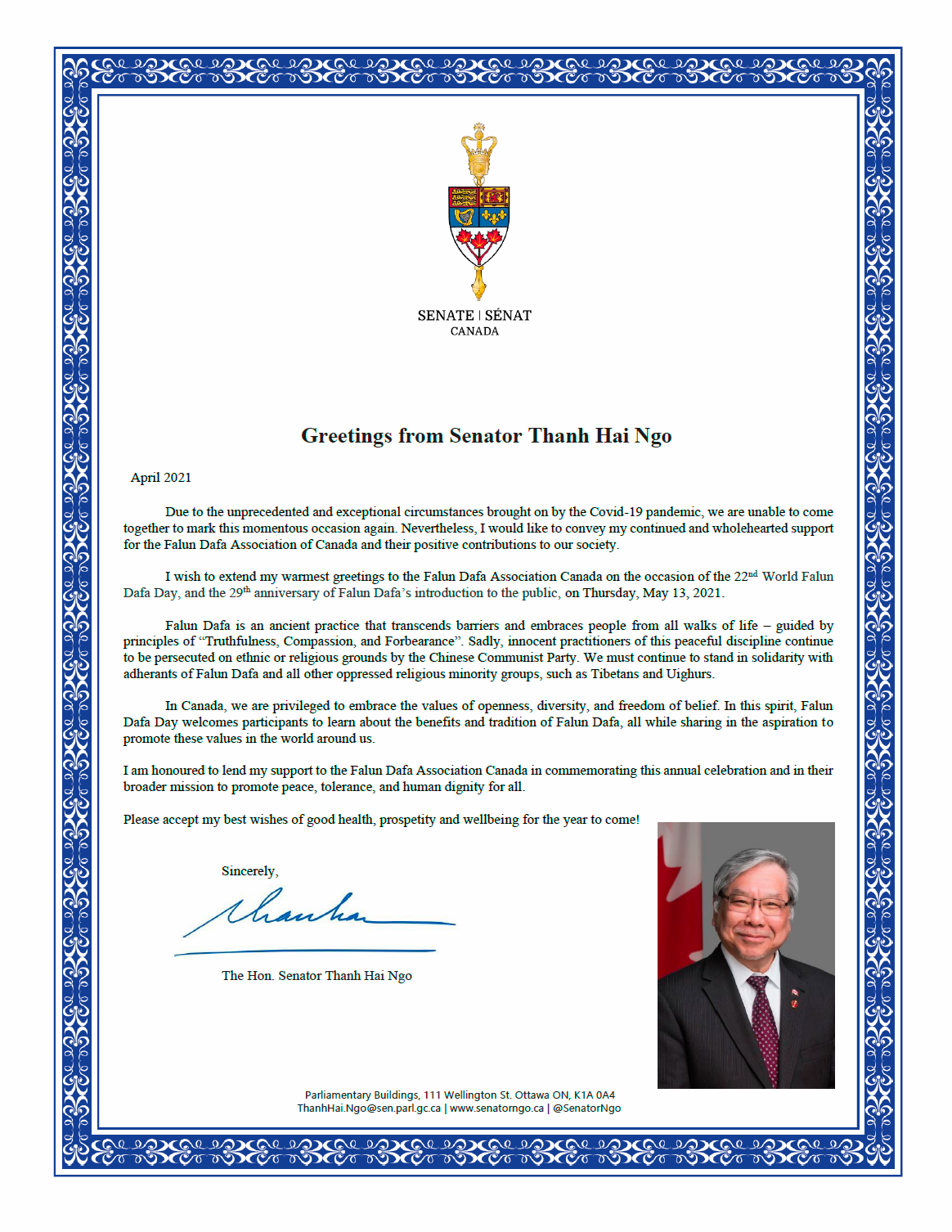 ![]() 图4:联邦参议员吴蓝海(Thanh Hai Ngo)贺信 |
