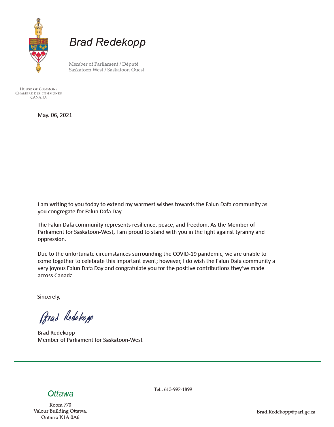 ![]() 图5:萨迪卡通地区国会议员布拉德·雷德科普(Brad Redekopp)的贺信 |