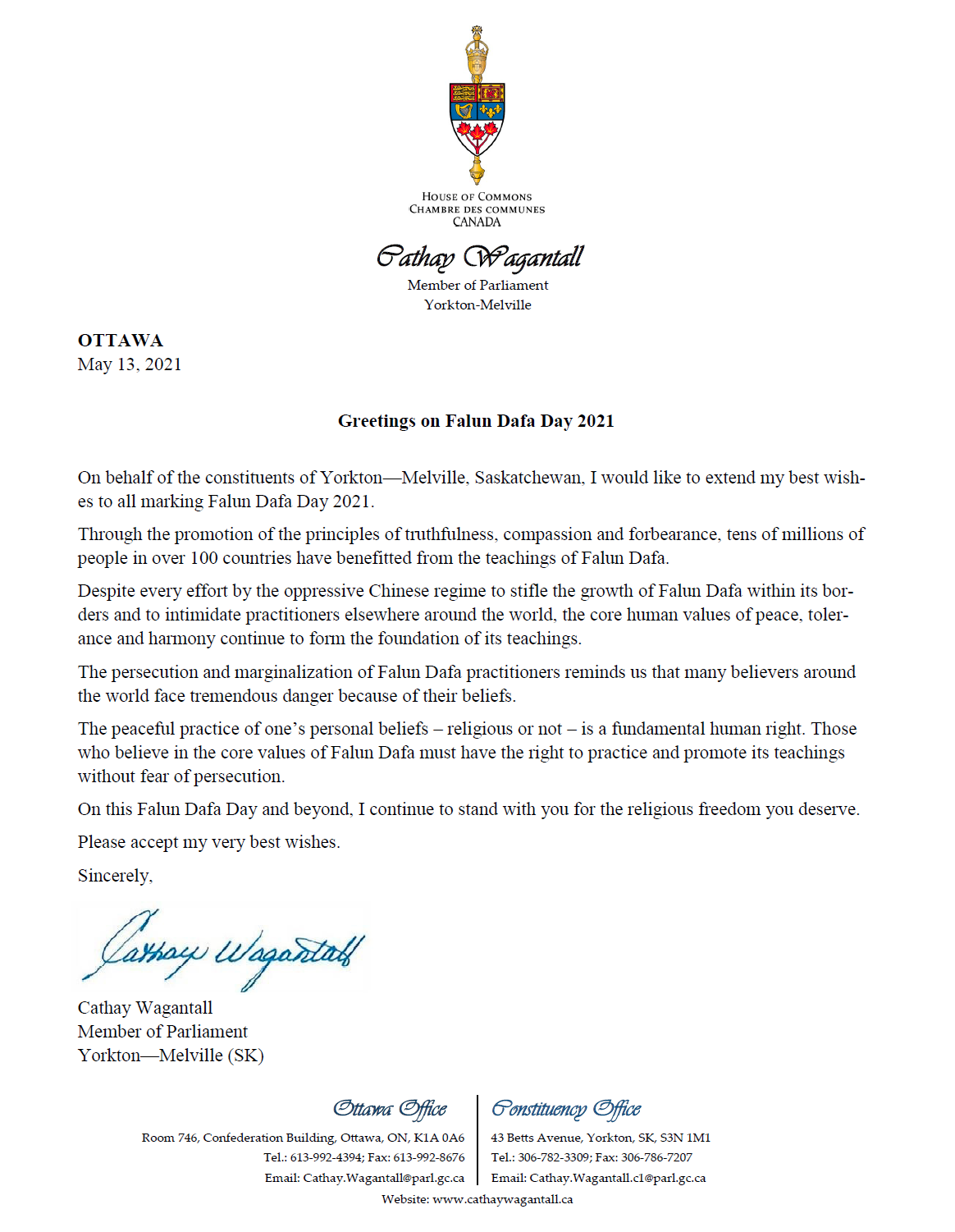 ![]() 图6:萨省国会议员瓦甘托(Cathay Wagantall)贺信 |