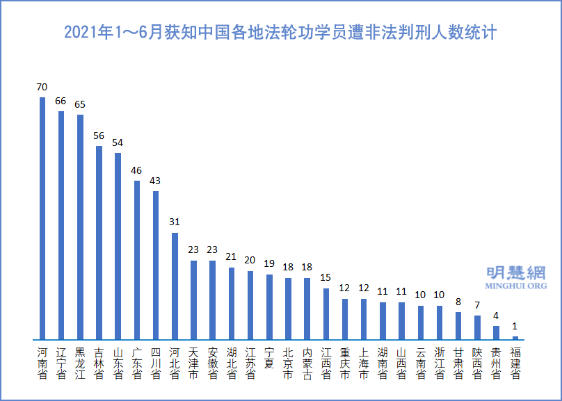 据明慧网报道统计,今年上半年至少有674名法轮功学员被非法判刑。迫害最严重地区是:河南70人,辽宁66人,黑龙江65人,吉林56人,山东54人,广东46人,四川43人,河北31人,天津23人,安徽23人,湖北21人,江苏20人。
