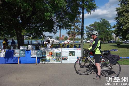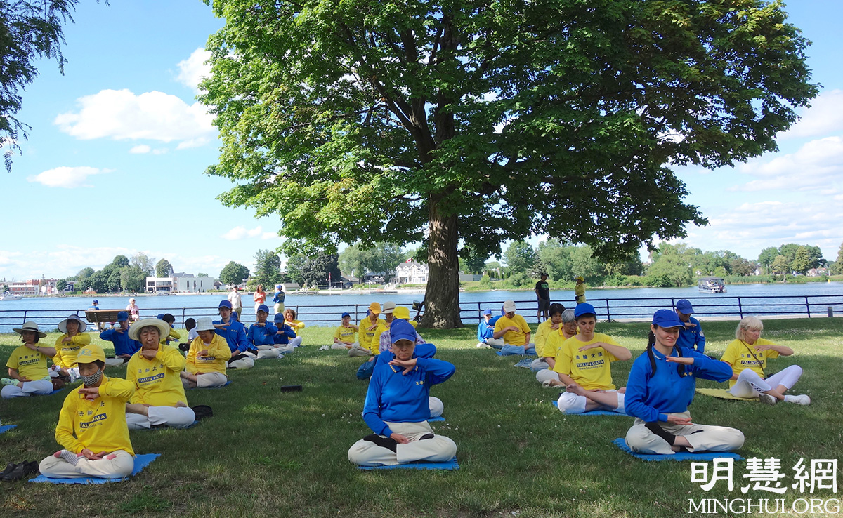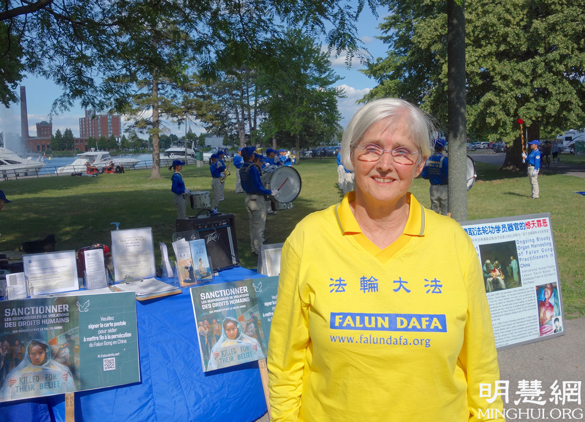 瓦勒菲尔德是圣劳伦河上的一个岛屿,也是一个风景如画的旅遊城市,当地居民以法裔为主。在河滨公园,法轮功学员拉开了“法轮大法好”、“真善忍好”横幅,天国乐团的演奏和五套炼功交替進行。祥和的场面吸引了公园里休閒消夏的民众,他们用鼓掌、双手合十来表达感谢。许多民众在和法轮功学员交谈后表示,支持法轮功学员反迫害。
