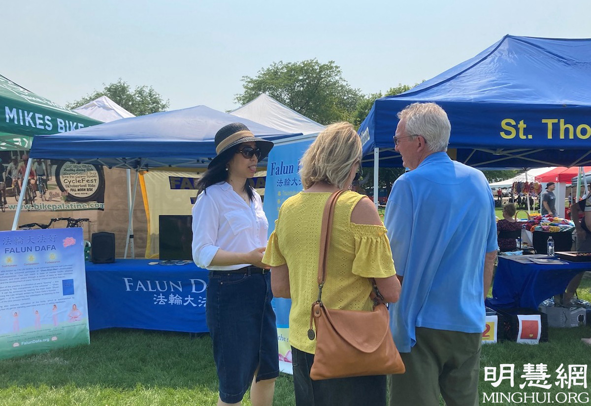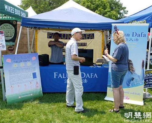 疫情解禁后的第一个独立日节庆,当地和附近城市的民众在高温下仍络绎前来。法轮功学员在展位上布置了法轮大法简介和大法弘传世界的展板,还有传单和小册子。学员伴随着祥和的炼功音乐展示功法,吸引人们驻足观看,并询问更多详情。