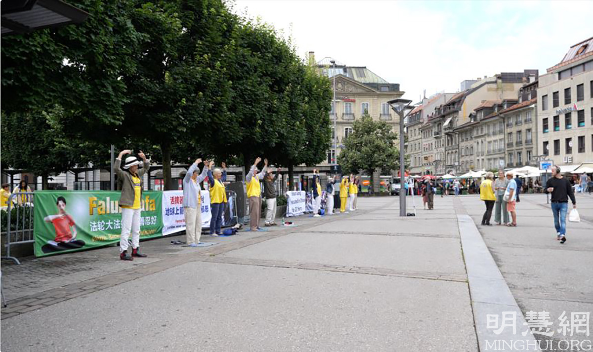 当天,法轮功学员来到地处市中心的乔治·匹彤广场(Place Georges Python)展示功法,向前来问询的民众讲述在中国,中共残酷迫害法轮功学员,甚至活摘器官等罪行。弗里堡州大议会议员埃丽卡·施奈德(Erika Schnyder)和俞贝赫·达夫隆(Hubert Dafflon)来到现场发表讲话,支持法轮功学员反迫害。