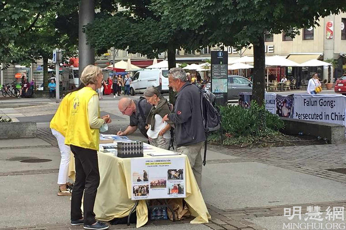 这是今年瑞士法轮功学员举办七二零反迫害活动的第五站,也是最后一站。今年,瑞士学员自七月十五日起,先在日内瓦州州府日内瓦(Genève)举办反迫害二十二年活动,随后到纳沙泰尔州州府纳沙泰尔(Neuchâtel)、沃州(Vaud)州府洛桑(Lausanne)以及汝拉州(Jura)州府德莱蒙(Delémont)举行反迫害活动。有十四位联邦国会议员、州议员市议员发来支持信,谴责中共迫害。各地经过活动现场的路人了解情况后,纷纷在请愿书上签字支持法轮功学员反迫害。