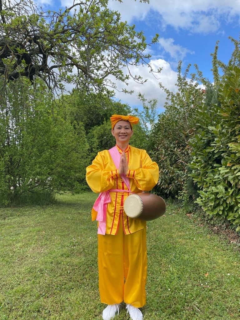 “我非常喜欢腰鼓队金黄色的服装,色彩亮丽夺目。”涵说自己虽然不是中国人,但对中文和中国传统文化十分青睐,她现在已经可以用中文阅读《 转法轮》了。“我了解到,腰鼓是中国一种民间鼓舞形式。中国传统腰鼓传递出一种“力”和“美”。法轮功的腰鼓队充满着真、善、忍的能量,鼓声欢快悦耳,振奋人心。腰鼓既能体现中国的传统文化,又能展现法轮功学员纯正、善良的精神面貌。”涵说。