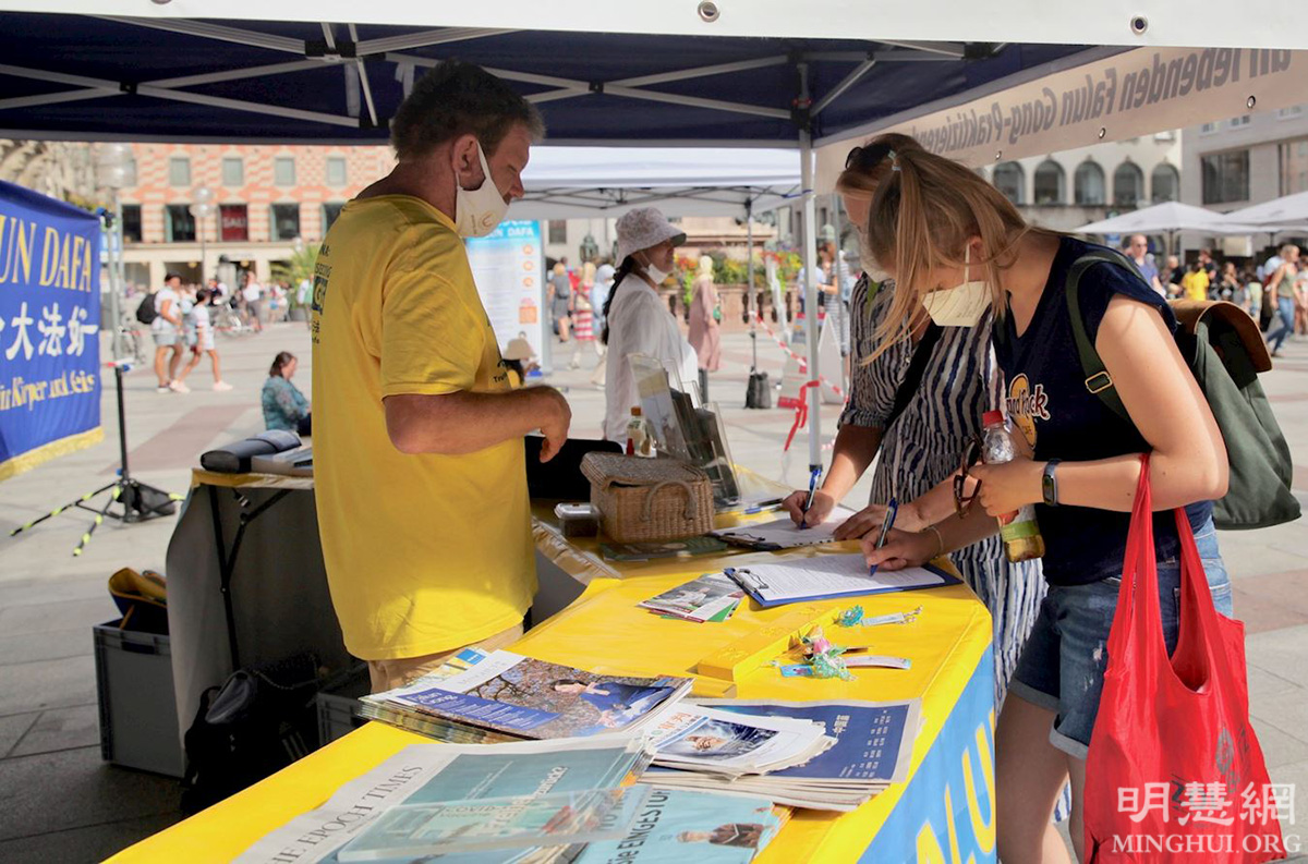 有位中国女士在玛琳广场与法轮功学员交谈了很久,最后用化名当场退出中共共青团。另一位德国女士签完名后也跟学员交谈了很久,她说自己就在附近上班,经常能看到法轮功学员举办的活动。“如果我现在不签名制止这件事(中共活摘法轮功学员器官),说不定哪一天,这事就会发生在德国了。”