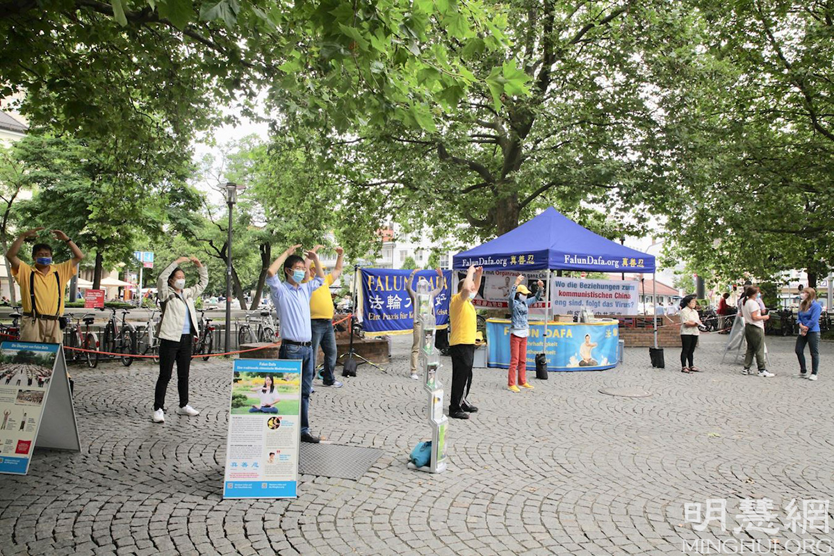 ![]() 图4:法轮功学员在红十字会广场(Rotkreuzplatz)展示功法。 |