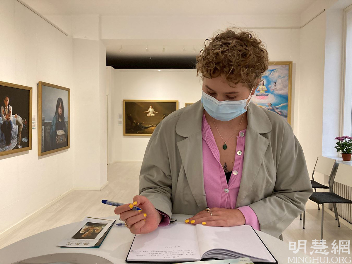 ![]() 图5:大学生阿达·凯斯蒂宁(Ada Koistinen)观赏了美展的感受是(对迫害的)难过、气愤,但同时也被法轮功学员的精神鼓舞。图为她在美展留言簿上留言。 |