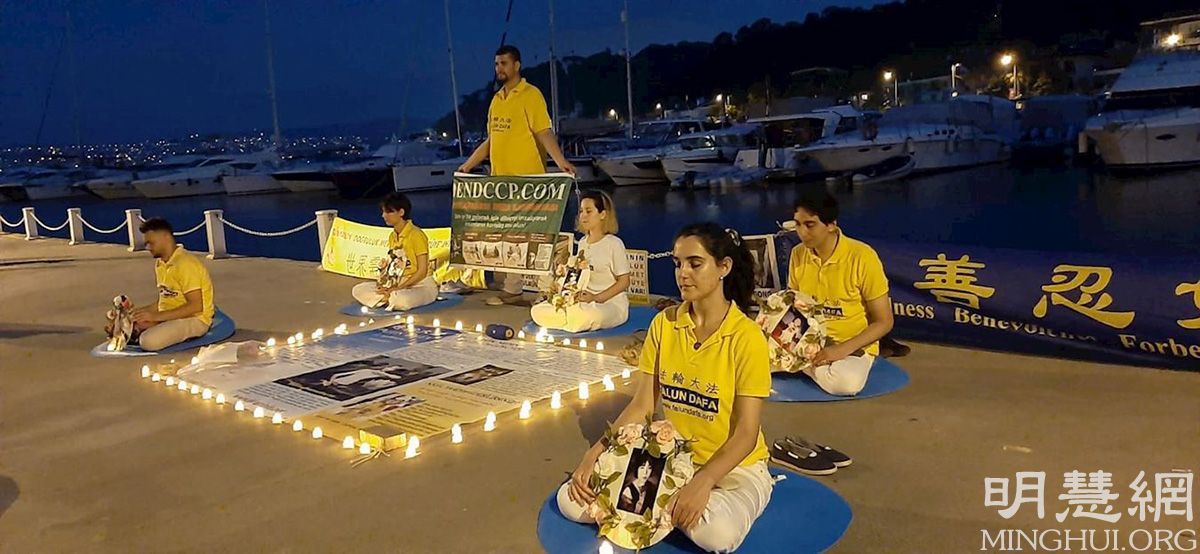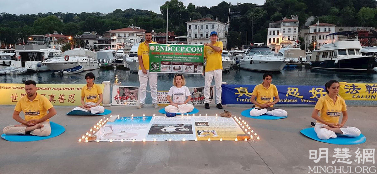 七月十八日晚,法轮功学员在中共驻伊斯坦布尔领事馆外举行烛光守夜,悼念被中共残酷迫害致死的法轮功学员。