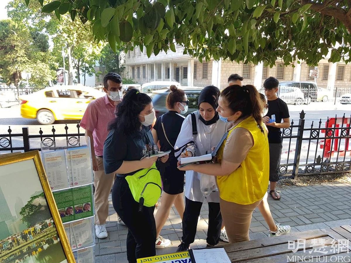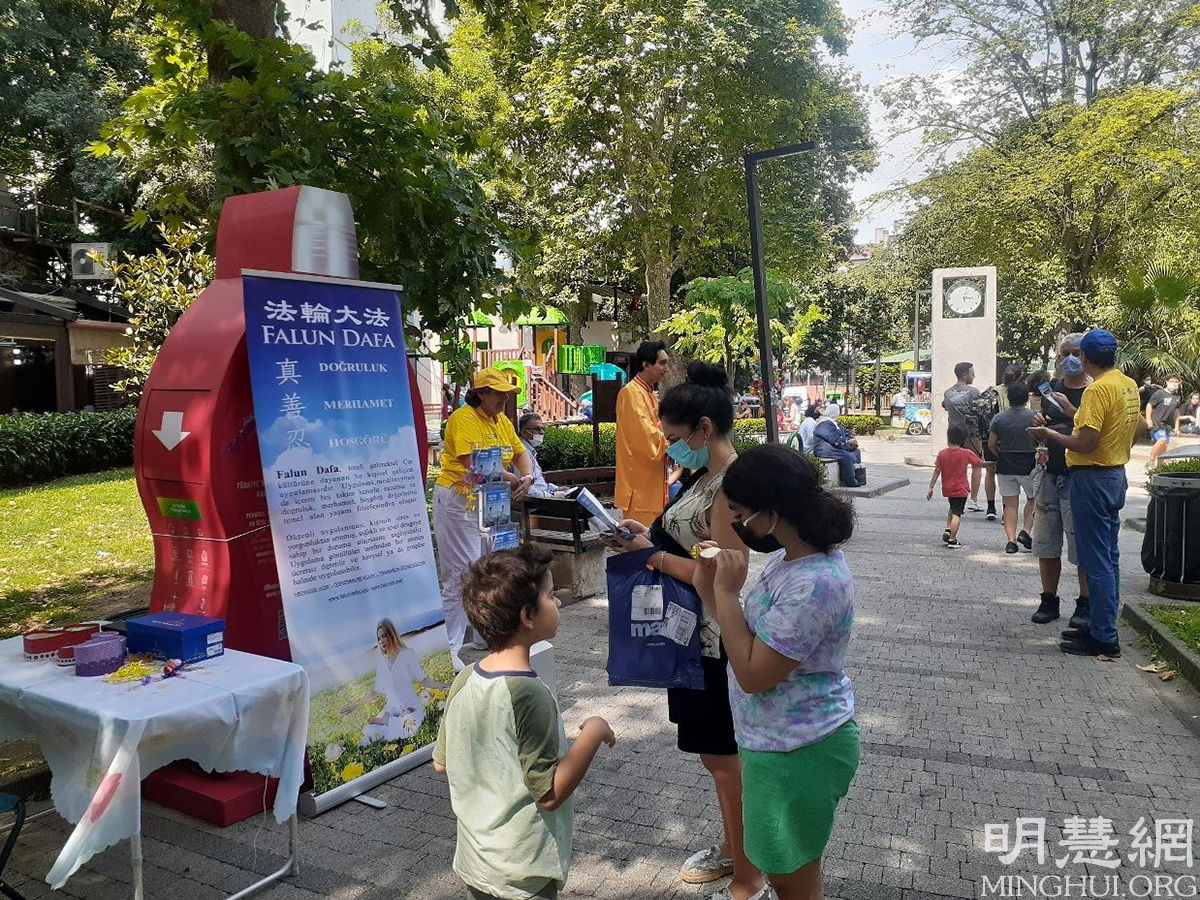 七月三日星期六,法轮功学员在伊斯坦布尔尼桑塔西(Nisantasi)区的米斯蒂克公园(Mistik Park)举行了讲真相活动。路过的人纷纷停下来了解发生了什么事。他们索取法轮功真相资料并阅读,并从学员那里得到详细的信息。