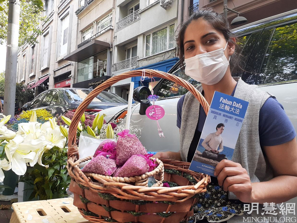 在公园门口卖花的坎苏(Cansu),兴致勃勃地观看法轮功学员的功法演示。她索要了一朵学员做的真相莲花结,并阅读了真相小册子。她说:“迫害是不对的,迫害不应该发生在任何人身上。”她还将真相莲花结挂在她的花篮上,供客人观赏。