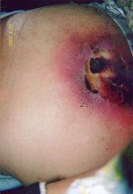 案例一:法轮功学员王洪荣,男,2004年9月24日被绑架,之后被非法判刑8年,被劫持到安徽宿州监狱。2007年2月份,王洪荣在监狱被迫害得从腰部以下部位均失去知觉,大小便失禁。2007年4月上旬,监狱警察指使犯人,用滚开的水,硬把王洪荣的双脚,按到脚盆里烫,顿时双脚立即血肿,半天后就起泡、溃烂。王洪荣到医院检查后被确诊:患胸椎肿瘤(骨癌),高位瘫痪,腰部以下无任何知觉,大小便失禁。2007年4月下旬,宿州监狱将已被迫害得生命垂危的王洪荣放回家。王洪荣回到家时,臀部后面褥疮有两个鸡蛋那么大(见图)。2007年6月22日凌晨,王洪荣离开人世,年仅59岁。