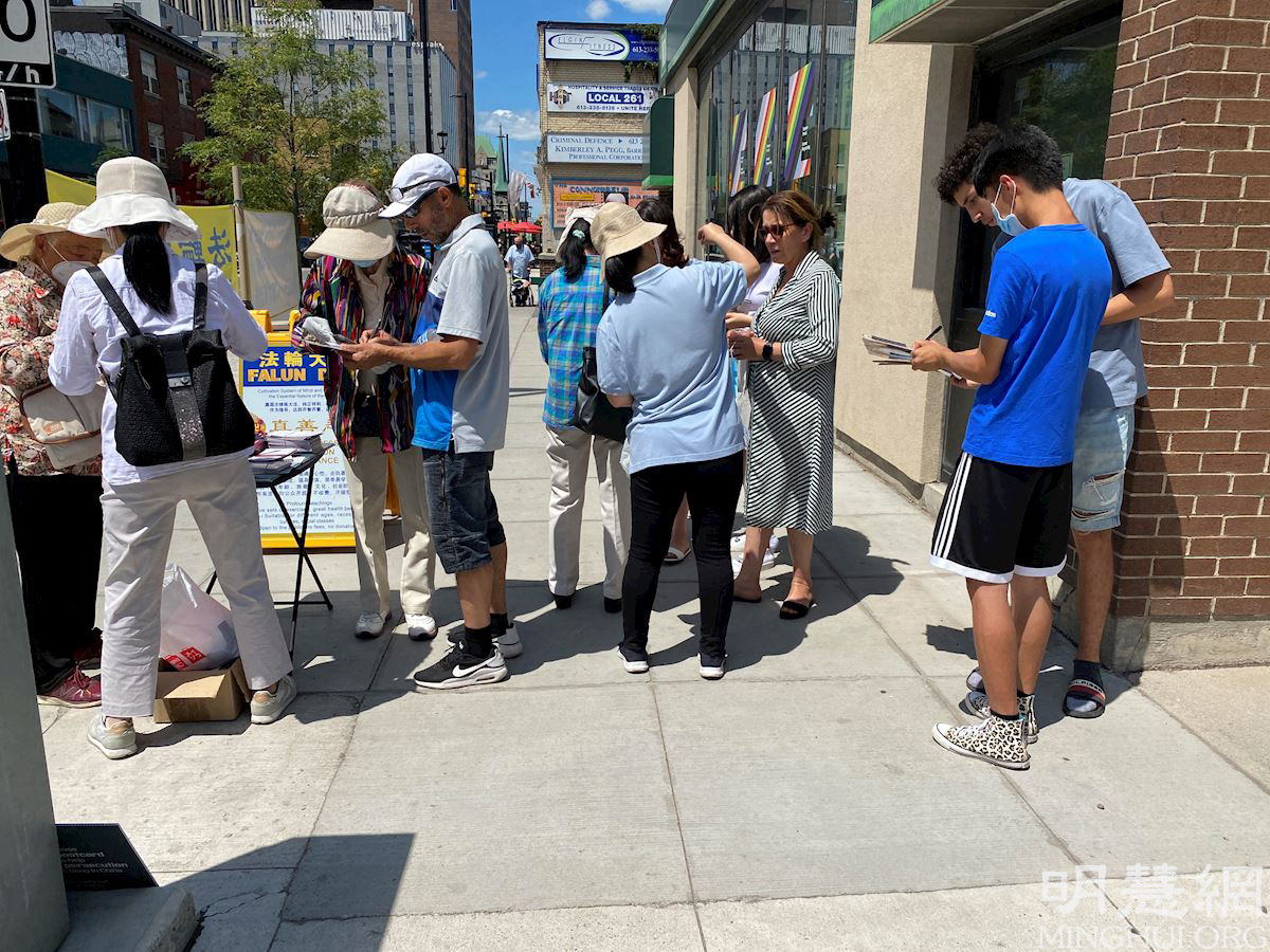 ![]() 图1~2:渥太华人在市中心的街道上,通过签名等方式表达对法轮功的支持。 |