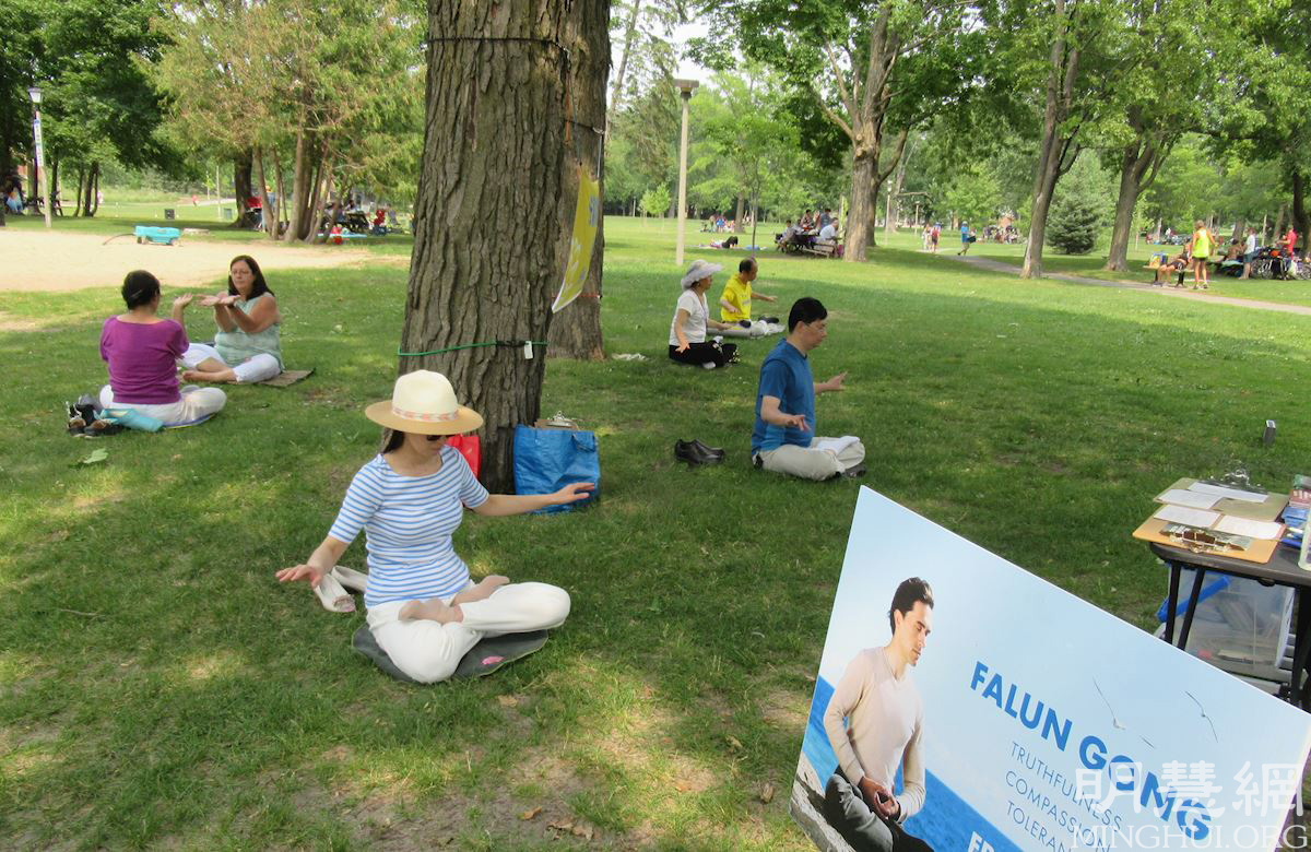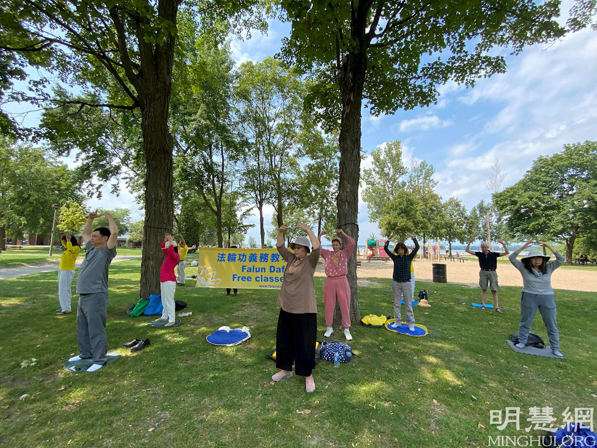 八月二十二日,德瑞克小姐(Annabelle Drake)和弟弟艾里奥(Elio)一起来到布雷坦尼亚公园(Britannia Park)的炼功点,学习法轮功功法。