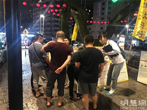 九年的台北经验,谢先生深感在景点向游客面对面讲真相的重要与效果。二零一八年回马来西亚后,他委托台湾学员制作整套真相展板运抵马来西亚,找到晚上游客络绎不绝的亚罗街,将整套真相展板排列人行道旁,每天晚上向来自世界各国的游客发资料讲真相。针对游客语系,文图并陈的展板真相包括英文、中文、马来文和韩文。