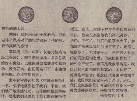 ◎ 67岁的高级工程师李凤鸣,患脑血栓四年,在长春第七期法轮功传法班上扔掉拐杖,从此能自己走路了。他激动得又哭又笑。在场的人目睹这神奇的一幕,无不惊叹:“神了!”他老伴当晚写感谢信,代表全家感谢李洪志师父。