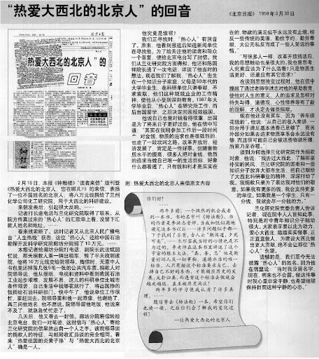 1998年2月16日《北京日报》“读者来信”版,表扬了一位不留姓名的北京人,他捐了8万元钱给兰州化工研究院用于大西北的科研建设,10万元给中国石油勘探开发科学研究院廊坊分院。这位北京人说:他修炼法轮大法后,对人生的意义、人的追求及心性修养有了新的理解,才决定做这些捐献。