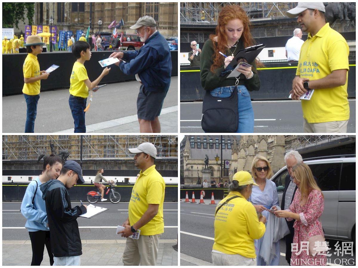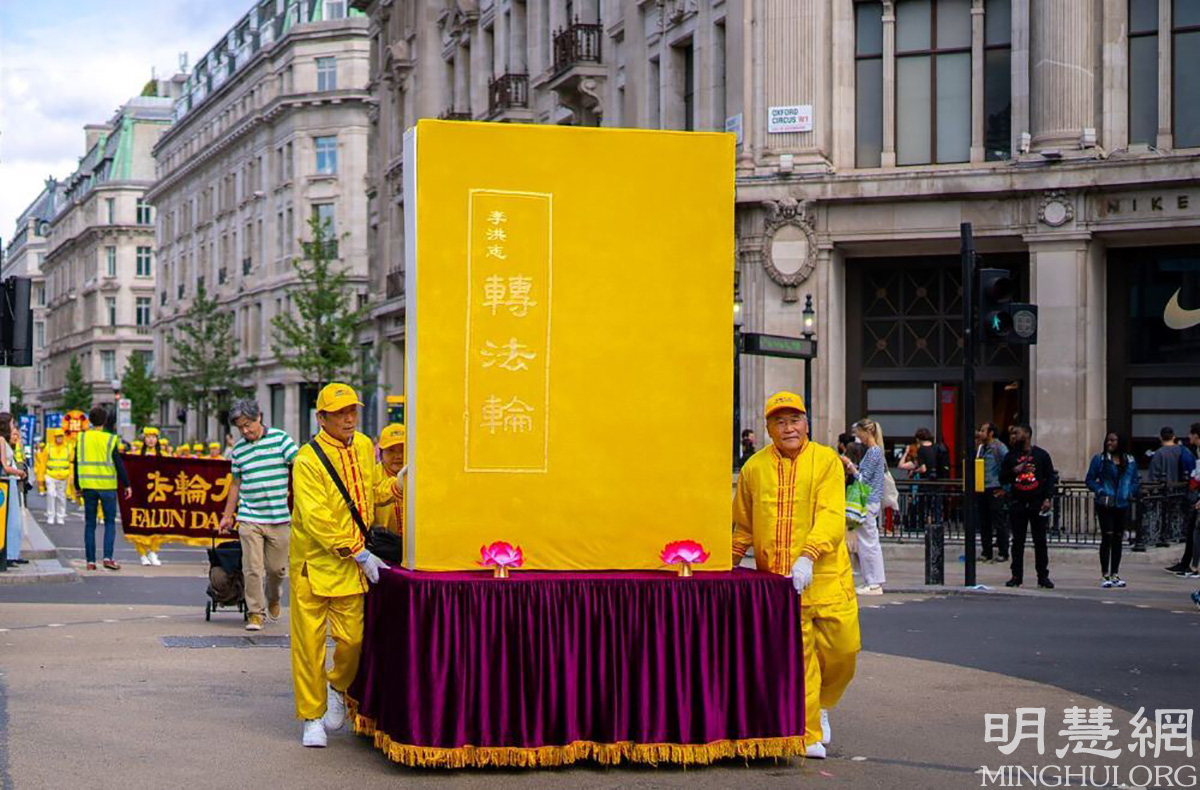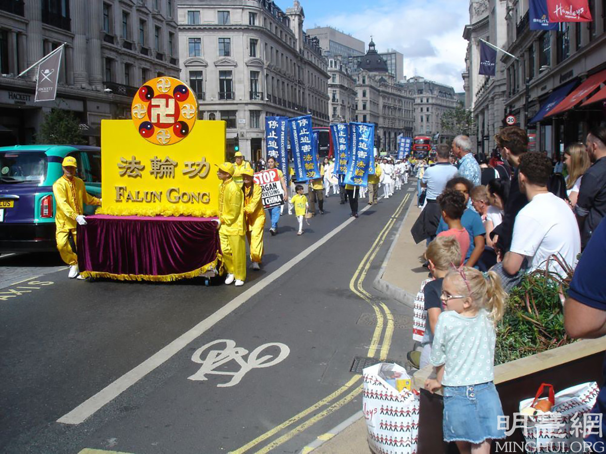 游行队伍于上午十一点十五分从伦敦中国大使馆对面开始,游行队伍包括法轮大法横幅、法轮功功法、大法书模、腰鼓队,反迫害横幅等方阵,浩浩荡荡的经过伦敦市中心最繁华的摄政街、中国城等地、鸽子广场、首相府所在地唐宁街,最终抵达议会广场。沿途吸引了很多人驻足观看,拍照录像,还有人向游行队伍合十感谢。