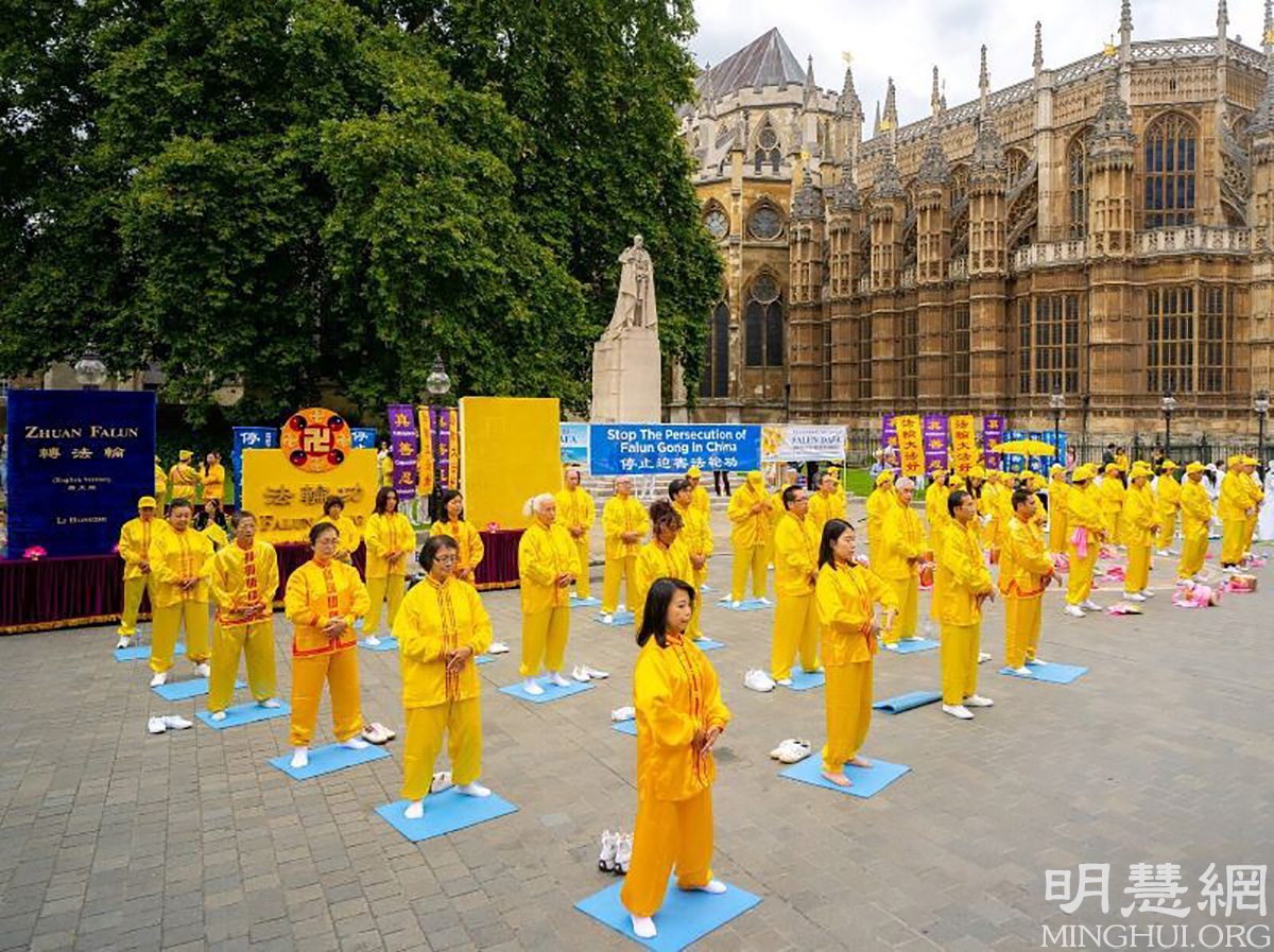 图7:二零二一年八月二十八日,英国法轮功学员在伦敦议会广场上演示功法。 |