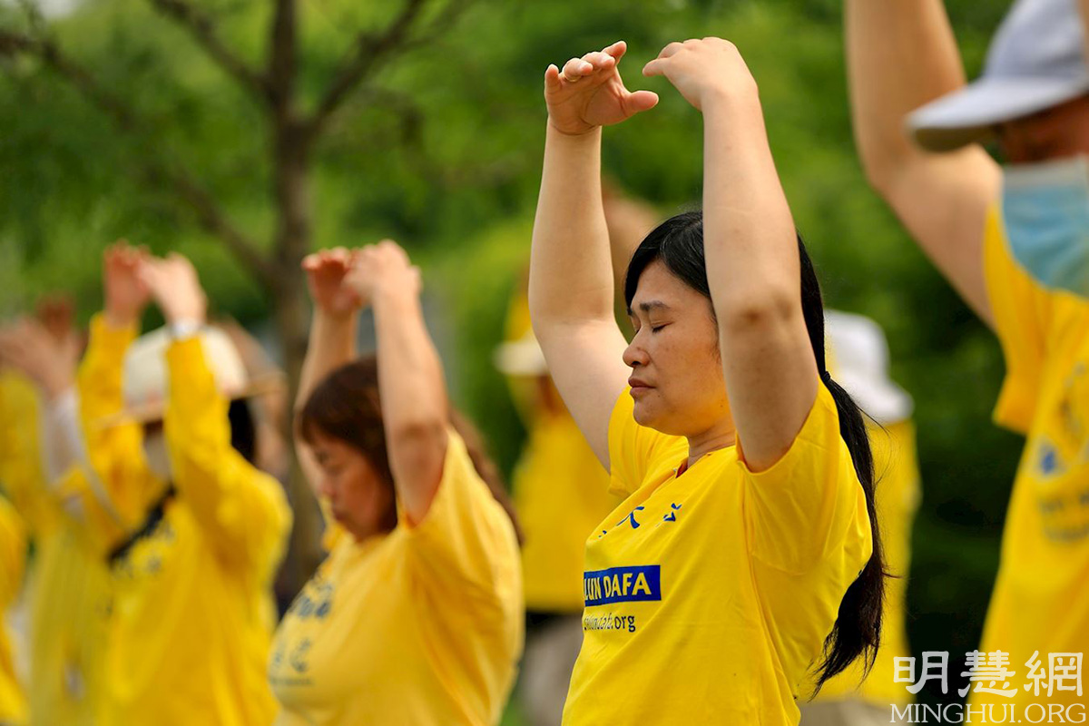 ![]() 图1:在法轮功学员反迫害22周年之际,原南京凤凰街法轮功炼功点辅导员李娥英在加拿大中使馆前参加反迫害集会,集体炼功。 |