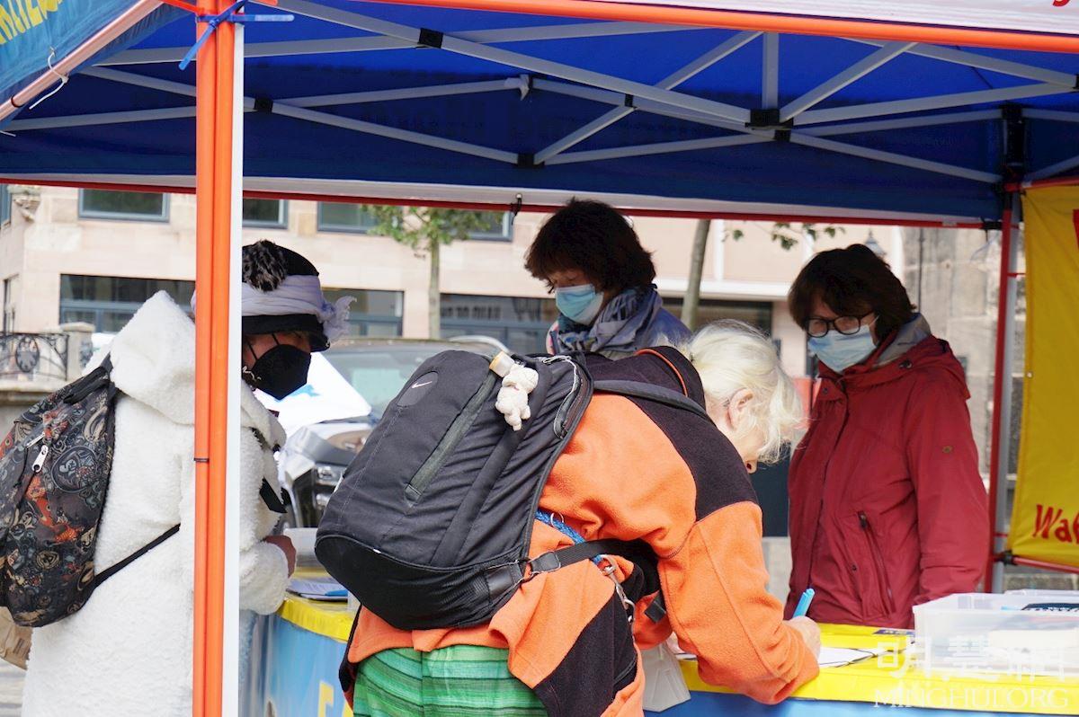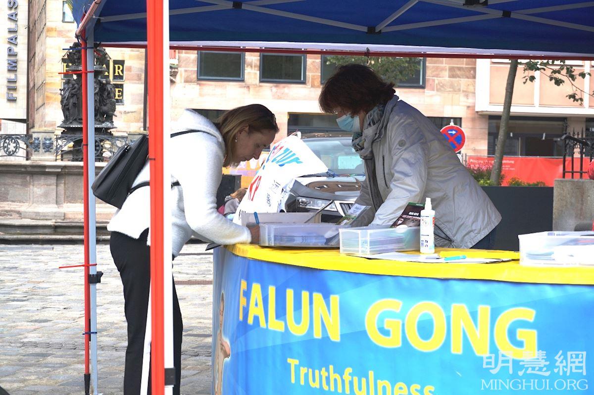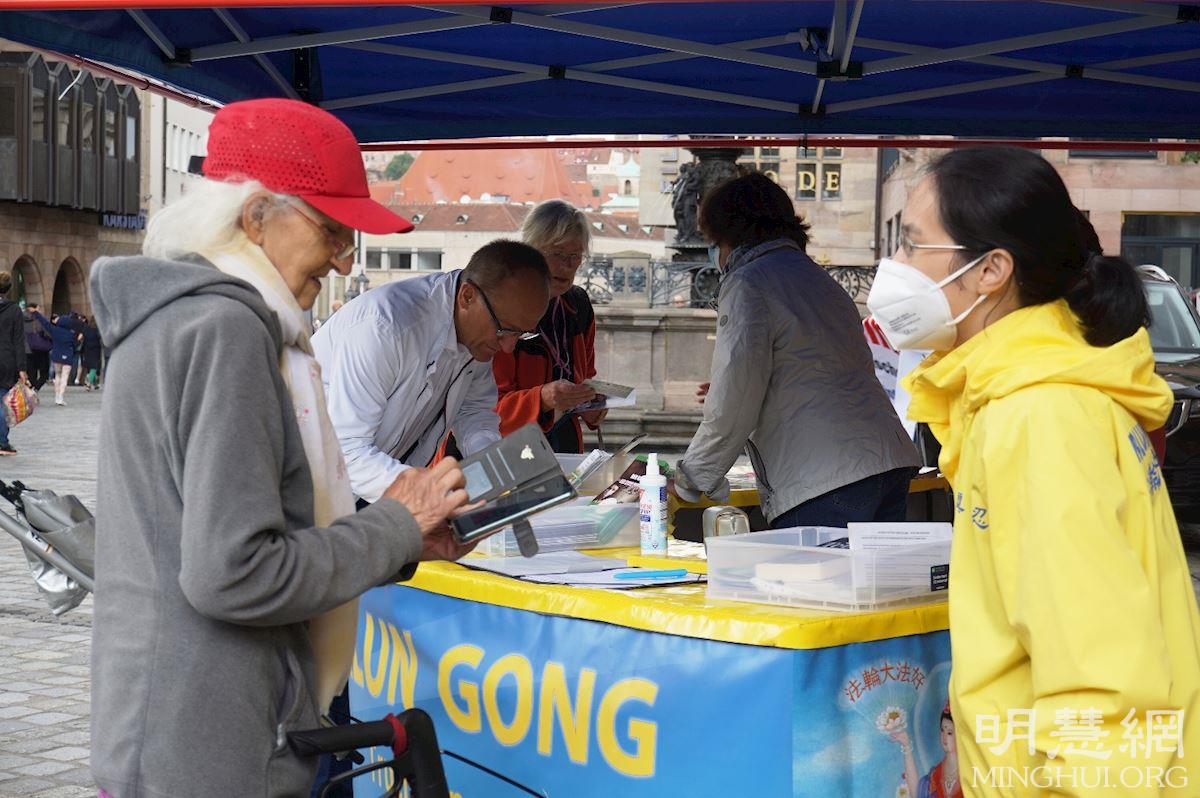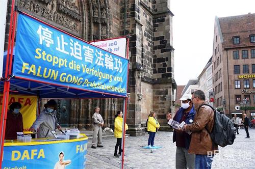 有些纽伦堡市民仔细询问法轮功学员在纽伦堡的炼功地点和集体炼功时间,并表示他们会来学炼法轮功。