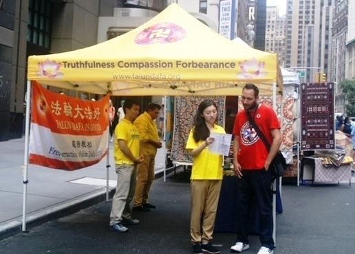 法轮功展位在百老汇剧院(Broadway Theatre)边上。该剧院有近百年历史,过去一年多来因为疫情关闭,今年六月一日才重新开放,当天经过这一著名地标的人群流量相当大,于是,美丽祥和的法轮功展位吸引了很多来自各地的有缘民众。他们相继而来了解反迫害真相并学炼法轮功的五套功法。有一位纽约人分享了他的亲人修炼法轮功之后身心受益、家庭和睦的故事。
