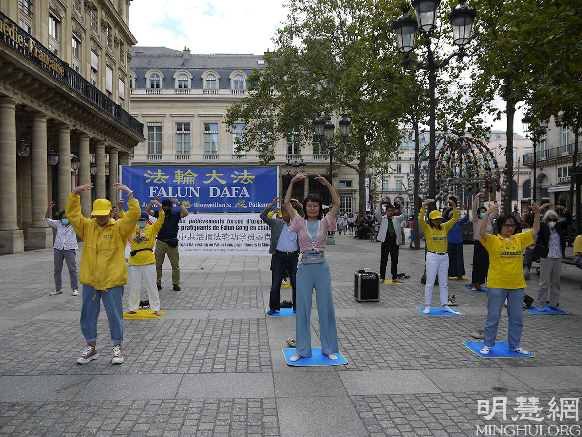 ![]() 图1:法轮功学员在柯莱特广场演示法轮功功法 |