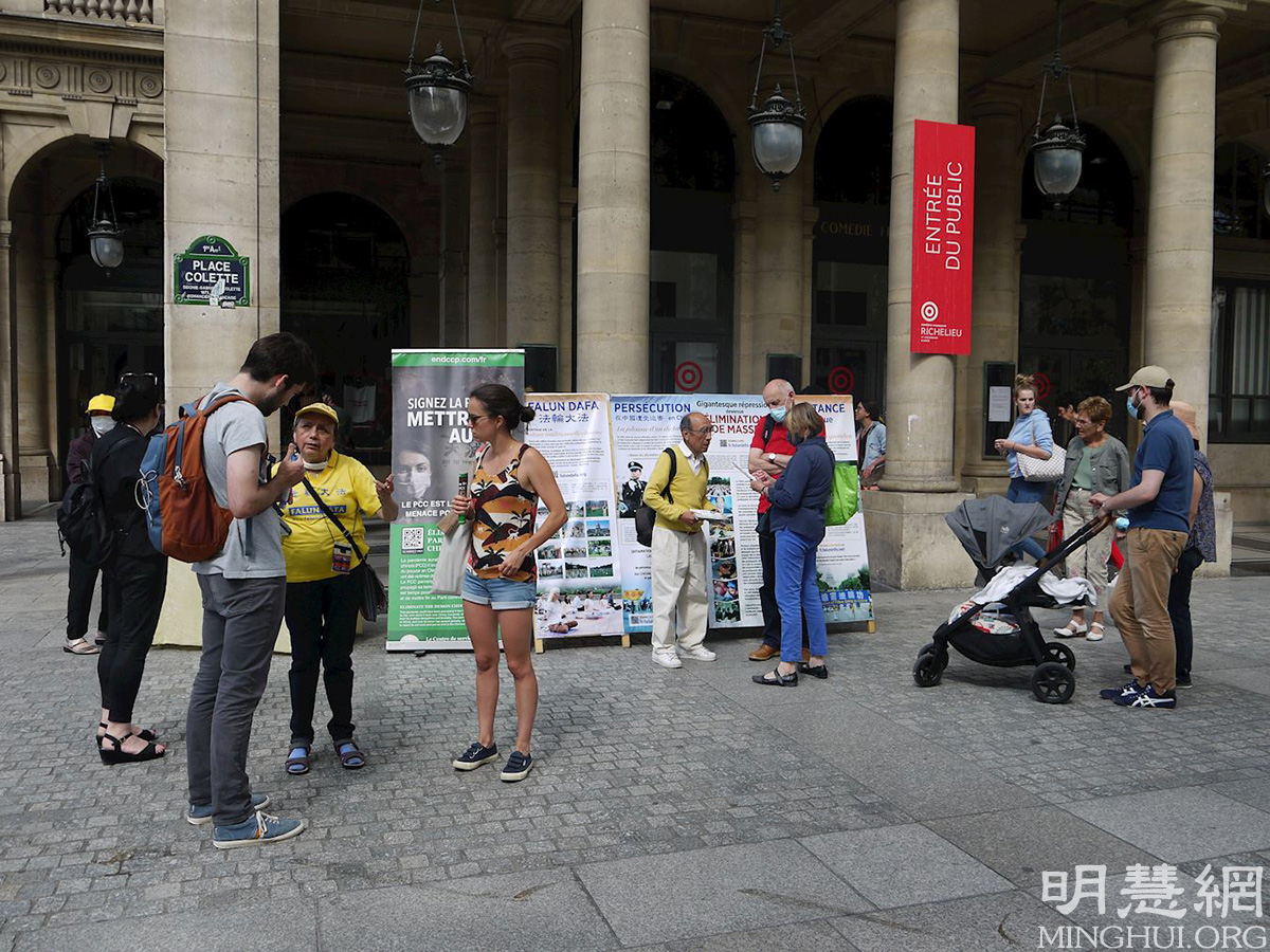 ![]() 图2~3:在柯莱特广场,游人观看展板,了解法轮功真相 |