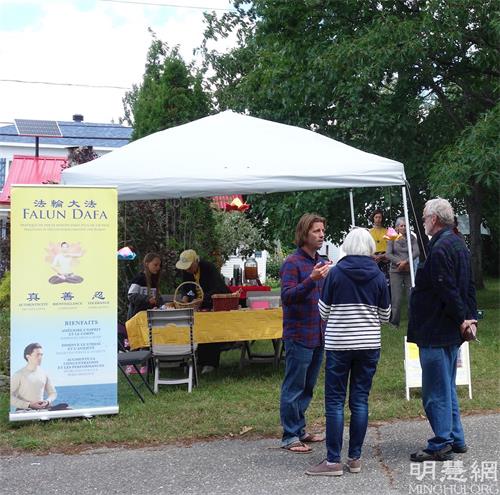 圣-安德扬是一个静谧美丽的村庄,镶嵌在魁北克东部延绵起伏的丘陵中。当地的几名法轮功学员每周六在集市上讲真相,教人们摺纸莲花,告诉人们信仰真善忍的法轮功学员在中国遭受的迫害。七月三十一日这天,因为几名周边地区法轮功学员的加入,学员们增加了集体炼功,为人们展示悠缓祥和的功法。