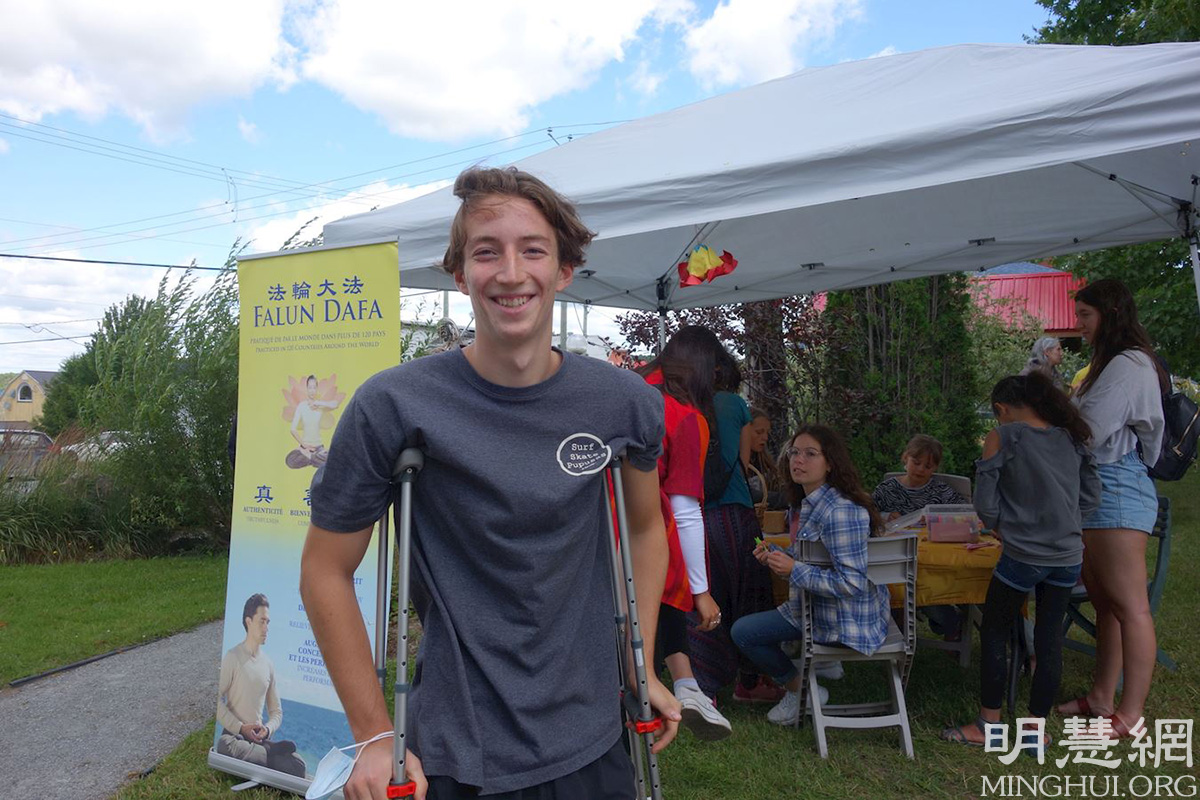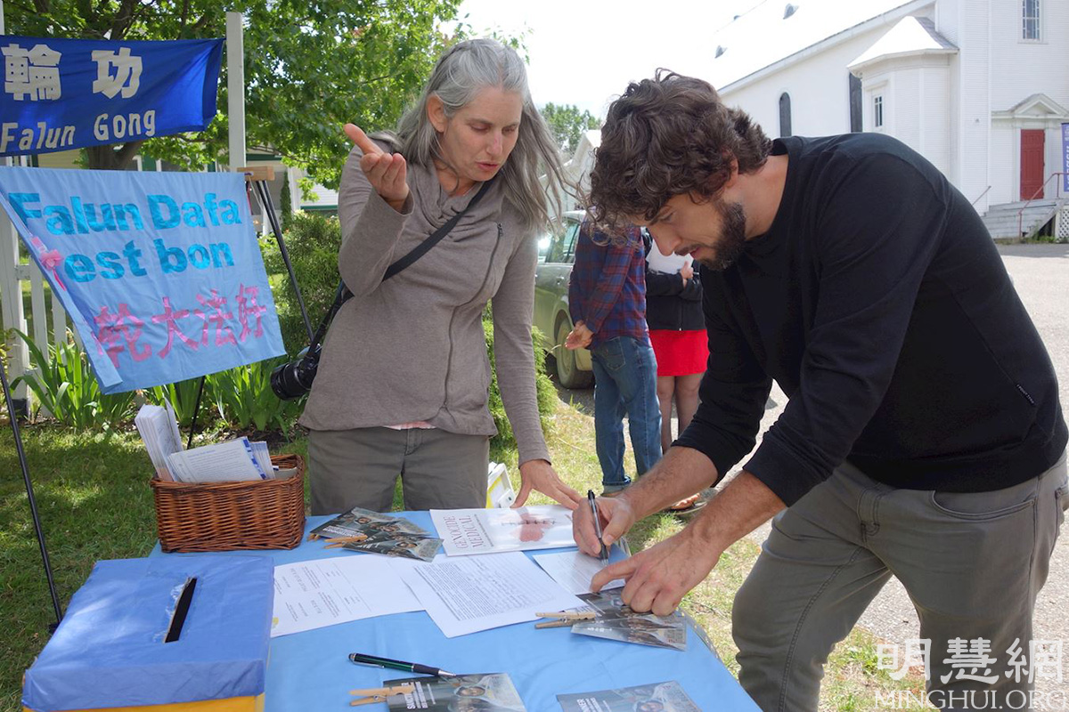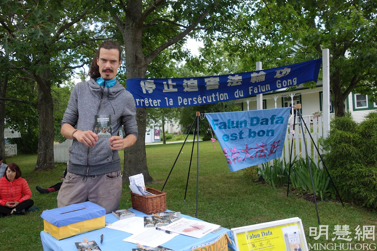 魁北克作家兼演员大卫·古德霍(David Goudreault) 来集市旁的工作室录音时,了解到了法轮功被迫害的真相,在呼吁停止迫害的明信片上签了名。
