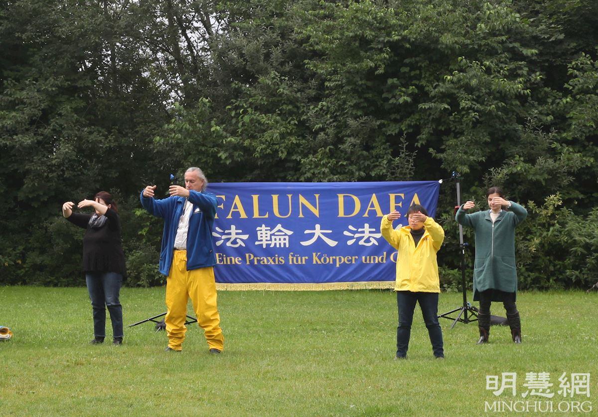 有一群原本在附近玩耍的小朋友多次前来信息台,询问法轮功学员在做什么。法轮功学员跟他们简单地讲述了真相,这样来回好几趟,最后他们问可不可以跟着打坐。学员在教他们的过程中,一位德国妇女带着两个孩子,也跟着法轮功学员学炼功法动作。